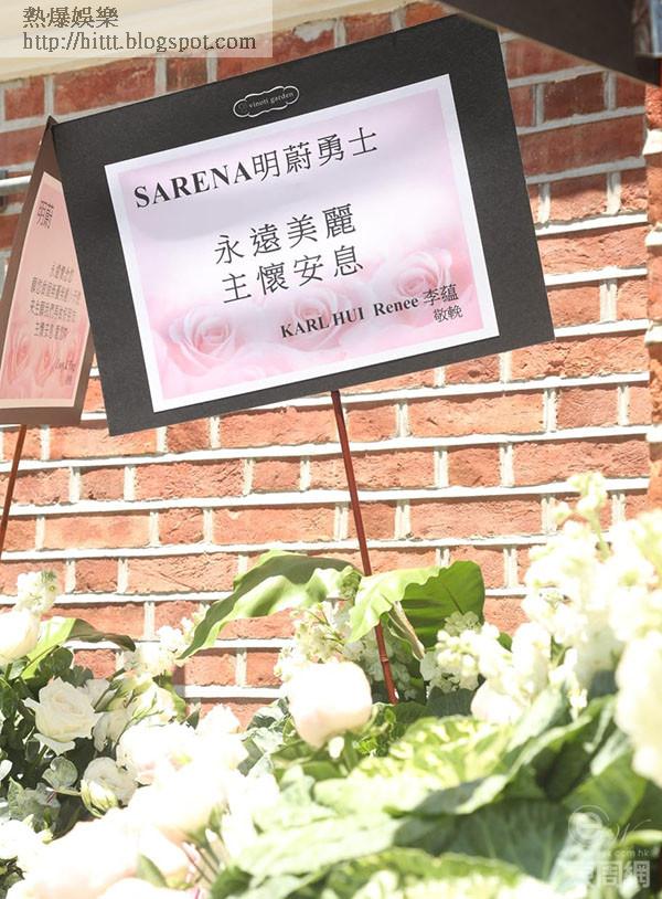 Sarena家人日前在其社交網專頁提到她生前喜愛粉紅色花朵,因此教堂內佈置以粉色為主,遺照Sarena戴上粉紅色及白色鮮花頭飾,面露微笑。不少花牌亦選擇粉色花朵,古天樂、周慧敏、李蘊及林淑敏等人都送上花牌。一直視Sarena為妹妹的馬浚偉早已到場打點,他負責於安息禮拜獻唱詩歌及唱出Sarena的個人單曲《交換愛情》。