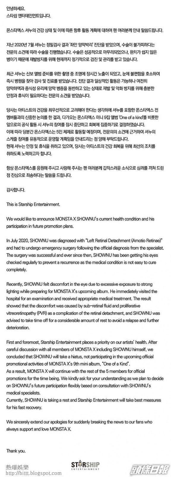 Starship娛樂續道:「雖然日常活動不受影響,但診斷結果顯示視網膜下仍有積水,而且有機會出現增生性玻璃體視網膜病變,為防止復發或惡化,需要充分的休息,Shownu將暫時中斷活動。」MONSTA X暫以5人體制活動,第9張迷你專輯《One of a Kind》維持不變,於6月1日推出。