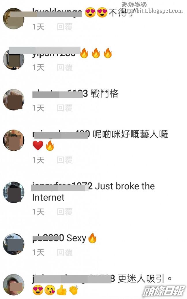 Alycia好快就順應民意放多張跪喺牀度,擺出食macron甫士嘅靚相,不過個身就由後面扭返去正面,相中Alycia有甜到漏嘅笑容,36E「導彈」喺緊身內衣big爆下露出半球,因為過份受壓迫,形成5吋深坑事業線,相當吸睛。不過,Alycia下身同樣搶Fo,除咗開高叉,仲展現咗大腿內側嘅誘人紋身,而她將雙腿微微張開嘅甫士,就令一眾宅男想入非非,愈諗愈hot,寫咗唔少露骨留言,亦有網民讚她「超正」、「辣到核爆」、「我唔得喇」、「So hot」、「Sexy」、「戰鬥格」、「不得了」、「更吸引」、「好誘人的紋身」、「噴血」、「妖精」、「愛人」等。