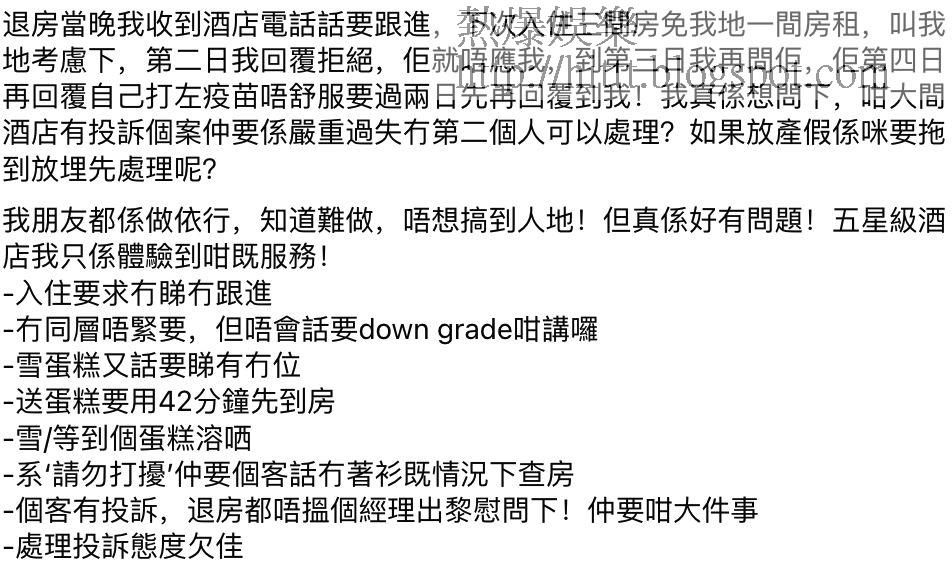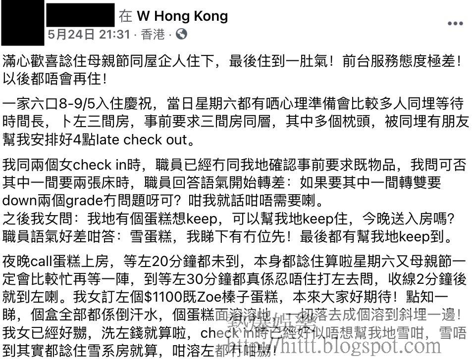 事主出post抱怨:「滿心歡喜諗住母親節同屋企人住下,最後住到一肚氣!前台服務態度極差!以後都唔會再住!」