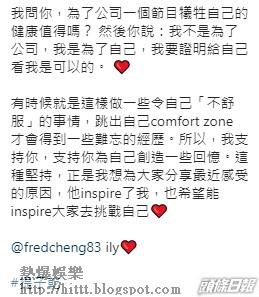 Stephanie續道:「訓練,跑步,晚上再浸熱水涼,別以為浸熱水涼好舒服,其實為了甩水,他浸的水溫是熱得快要燙手😔 (備註:這種方法是超級不健康,不要在家試)每次你浸浴,我必須在旁,因為每一次你上水也是幾乎休克的狀態😭知道你早幾天在訓練時候暈倒,我真的好想哭。」她曾問Fred為公司的節目犧牲健康是否值得,不過對方答她是為了證明自己做得到,Stephanie聞言也支持老公跳出Comfort zone(舒適圈),挑戰自己。
