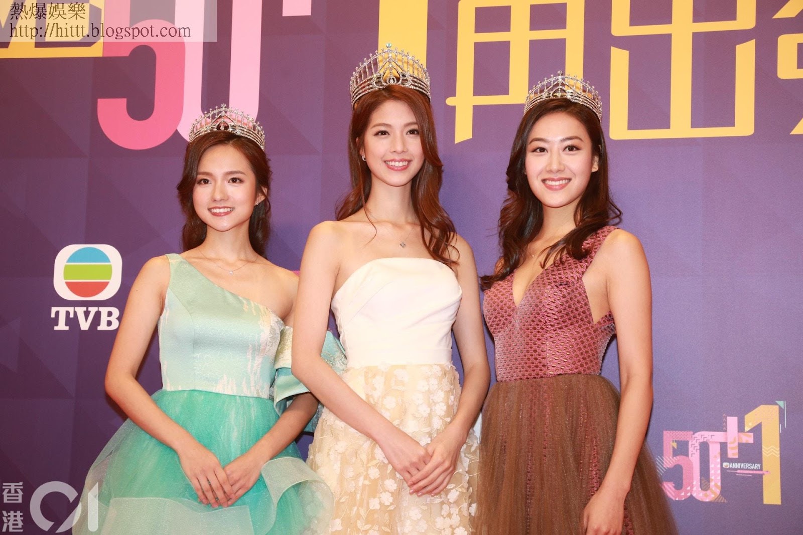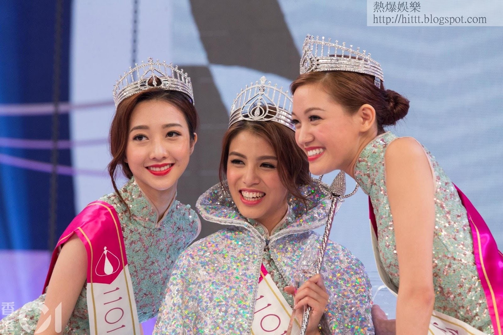 2015年港姐冠軍係麥明詩(圖中),左邊是亞軍龐卓欣,右手邊是季軍郭嘉文,即現在李澤楷女友。(視覺中國)