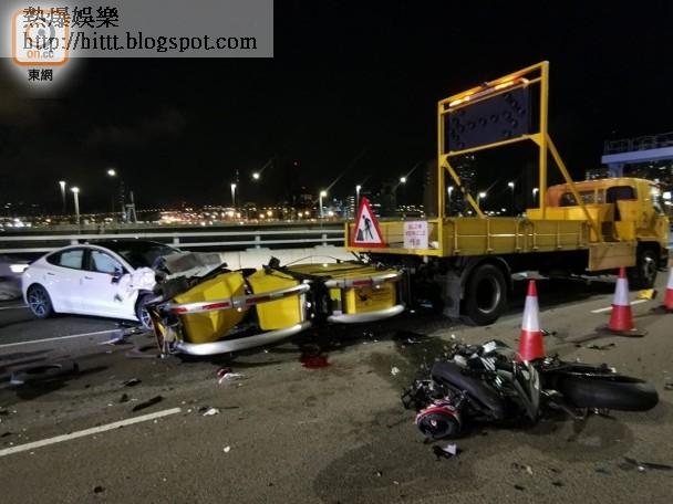 意外發生後約5分鐘,一輛Tesla電動車駛至,當時有隧道職員在場處理,姓宋(41歲)司機疑收掣不及撞向工程車尾,幸未有撞倒人,宋亦無受傷。現場路面遺下鐵騎士的波鞋、頭盔及一攤血漬,碎片散布一地,鐵騎士清醒送院搶救。
