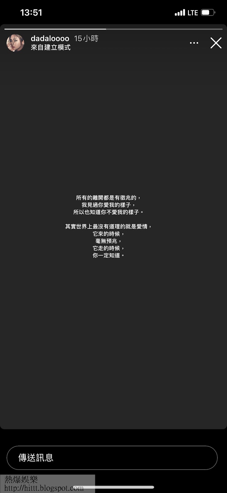 盧頌之(DaDa)和健身教練老公趙勁皓(King)於2017年奉女成婚,女兒趙安嵐跟King同樣是3月出生,現已4歲了,兩夫婦不時在社交網貼相晒幸福,然而,昨晚約9時,DaDa忽然在IG的限時動態貼黑底白字:「所有的離開都是有徵兆的,我見過你愛我的樣子,所以也知道你不愛我的樣子。其實世界上最沒有道理的就是愛情,它來的時候,毫無預兆,它走的時候,你一定知道。」