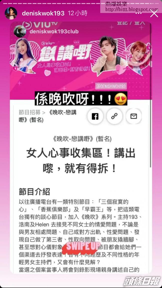 ERROR人氣王193(郭嘉駿)近日廣告及代言接到手軟之餘,自稱「ViuTV洪天明」的他,除了為多個節目擔任嘉賓,稍後更有機會單飛主持節目《晚吹—戀講嘢(暫名)》!昨日ViuTV於官方Facebook專頁出Po,公佈《戀講嘢》將由193、「口罩小姐」冠軍浩南(鄭伊琪)及曾參加《美選D.n.A》的譚凱倫(Helen),化身「戀愛專家」為絲打們解決感情問題。