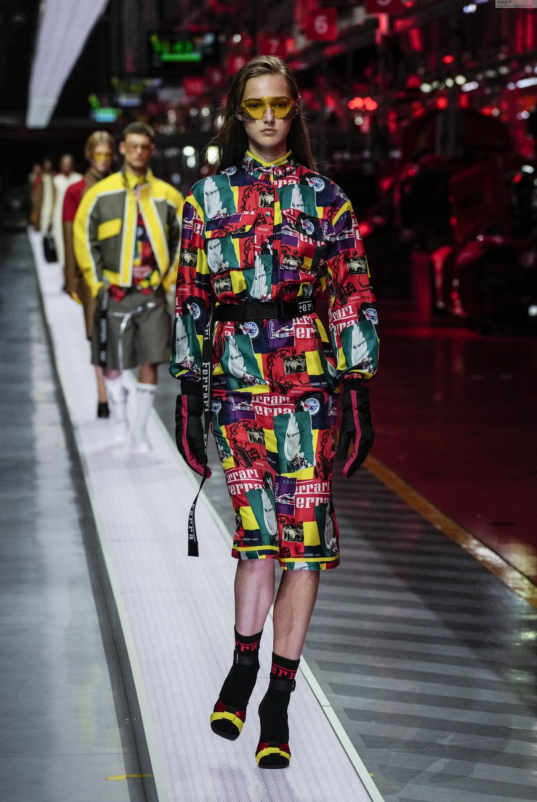 加大碼、巨膊剪裁boxy風的西裝褸、biker等飾似立體線條大口袋,帶賽車選手制服味的車線padded 皮革外套、風衣等,全配以運動長褲、短褲。時裝味濃的oversized外,lifestyle格局、可穿性高企的款式更多。紅黃黑白外,電光藍色亦成為主打色,大坃colour blocking及拼皮、拼色效果;獨特的材質衣料及機能風亦滲出一點 futuristic edge。汽車本業下的型格運動風,Ferrari的名字、logo等變作不同的印花圖案及裝飾,用上世紀40-60 年代古董法拉利相片、雜誌封面製成的復古味印花,配以鮮艷頻色,曬冷之餘亦同樣帶來新鮮感。