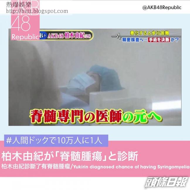 日本組合AKB48人氣成員柏木由紀,下月將滿30歲,她創下了AKB最大年紀成員的紀錄,更自稱要做最大年紀的偶像。不過,近日她參與一個健康資訊節目,日前播出預告時,已傳她患上罕有怪病,昨日該節目播出,更令外界大吃一驚,原來柏木患上了一種10萬人當中只有1人有機會患上、名為「脊髓空洞症」的罕有疾病,若然不好好治療,嚴重的話,可能會出現很大範圍麻痺的現象,更可能會導致腳部、半身麻痺而不能行走!