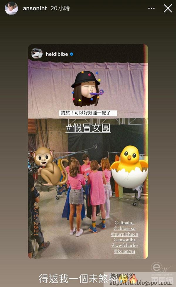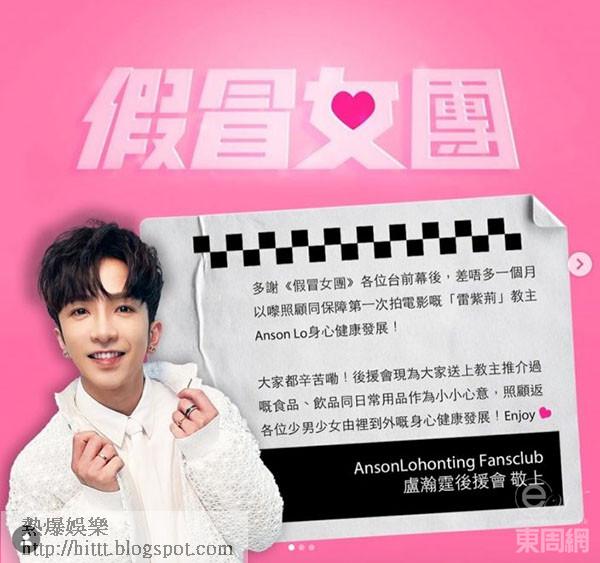 Anson Lo(盧瀚霆)首次參與拍攝的電影《假冒女團》已接近完成,眾演員陸續完成戲份,Anson Lo的一班「神徒」為感謝台前幕後對「教主」的照顧,特意準備了過百份「教主」曾推介的物品作小禮物送給劇組。Alina(李炘頤)在社交平台分享Anson Lo派禮物時的短片,笑言好正好sweet。Heidi(李靜儀)則表示自己已經完成拍攝工作,終於可以好好睡一覺,卻令Anson Lo非常羨慕,以哭哭表情留言說:「得返我一個未煞科。」