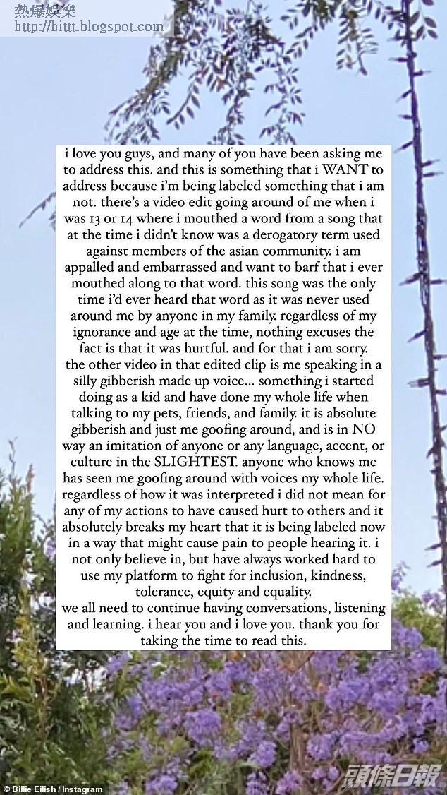 昨晚Billie Eilish在IG限時動態撰長文道歉,「網上有一段我13、14歲時的片段,當時我說出了歌曲中的一個字。不知道這個字對亞洲社會帶有貶意的我嚇壞了,也覺得很尷尬,曾說出這個字令我作嘔。不是疏忽也不是年幼,我的確說過傷害人的說話,責無旁貸,很抱歉。」