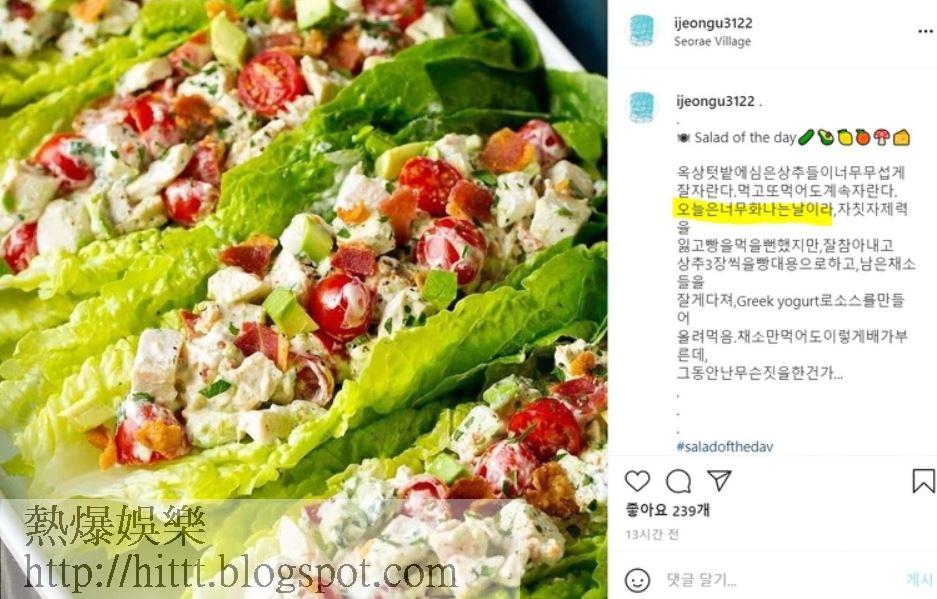 李貞宇昨晚在IG上載一張沙律照片,寫道:「種在屋頂的生菜長很快,吃了再吃還是持續地長。今天是很生氣的日子,差點失去自制力吃了麵包,好在忍下來了。」暗示對離婚謠言太憤怒,差點大吃洩憤。