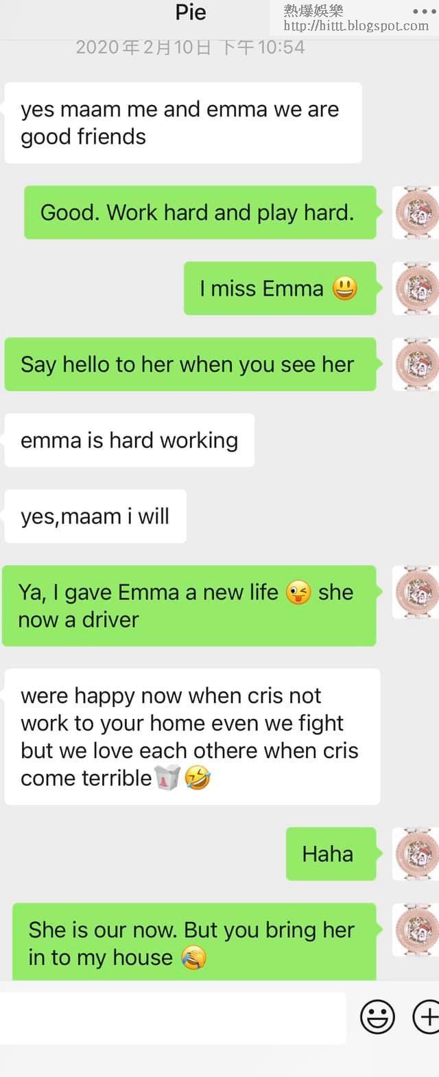 至於蔡一鳳發出帖文回應事件,並貼出與外傭的對話截圖。她寫道: