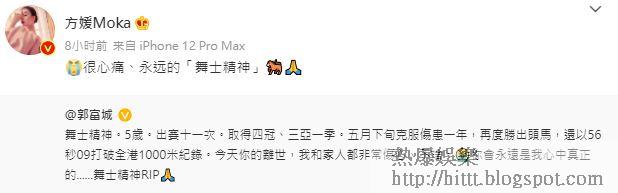 對於愛駒去世,城城感到十分難過,在微博留言說:「舞士精神。5歲。出賽11次。取得四冠、三亞一季。五月下旬克服傷患一年,再度勝出頭馬,還以56秒09打破全港1000米紀錄。今天你的離世,我和家人都非常傷心、不捨。你會永遠是我心中真正的……舞士精神,RIP。」方媛亦有轉發城城的留言,並說:「很心痛、永遠的『舞士精神』。」
