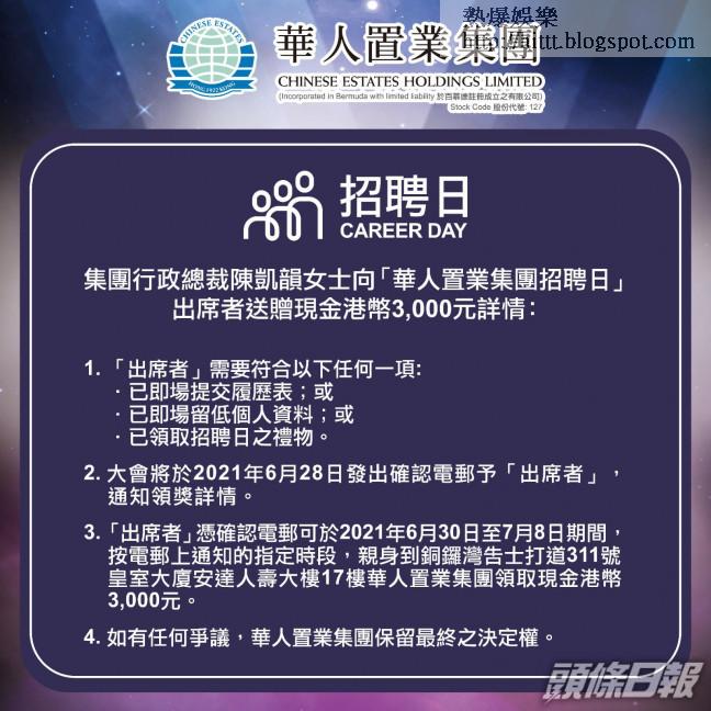 新冠肺炎疫情影響各行各業,令本港失業率大幅飆升,有見及此,身為華人置業CEO的「大劉」劉鑾雄太太陳凱韻(甘比),也特別於昨日(27日)假The ONE舉行集團招聘日,為市民提供約600個全職及兼職就業機會,吸引約1,500名求職者參與,反應熱烈。出席的求職者除獲得商場現金劵港幣200元,以及雙妹嘜防疫物品外,甘比更決定向各人送贈現金港幣3,000元,合共約450萬元!