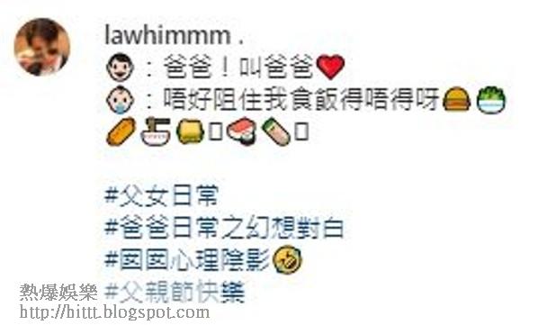 藝人羅子溢與老婆楊茜堯去年4月榮升父母,身為廿四孝爸爸嘅羅子溢不時於社交網分享與「前世情人」、1歲愛女小珍珠嘅相處點滴,呢日佢就晒出餵囡囡食飯嘅合照,期間見佢靠近囡囡,頭貼頭、鼻貼鼻,兩父女非常甜蜜,但見小珍珠表情無奈,而且嘴角似食完飯未抹嘴,原來係羅子溢趁囡囡食飯時,不停嗌佢:「爸爸!叫爸爸!」而佢亦代囡囡表達心聲:「唔好阻住我食飯得唔得呀?」又留言笑指:「父女日常,爸爸日常之幻想對白,囡囡的心理陰影。」相當搞笑。