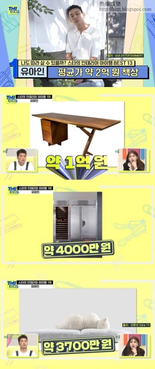 另外,日前播出的《TMI News》節目中就公開「明星裝修項目Best 13」,當中劉亞仁就獲得第一名,他家中的小熊梳化被指價值3,700萬韓圜(約25.8萬港元)、雪櫃價格為4,000萬韓圜(約27.8港元),單是家中裝修就高達5億韓圜(約347.5萬港元),而花費最多就是價值1億至3億韓圜(約69.5萬至208.5萬港元)的桌子。