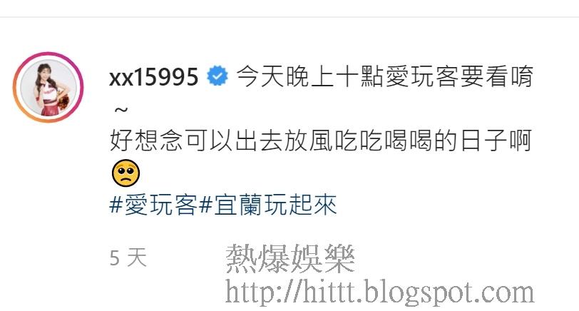 陳怡叡1日在Instagram上貼出一張養眼照片,替節目《愛玩客》宣傳。她也坦言疫情在家不能出門十分想念過去出遊的快樂時光:「好想念可以出去放風吃吃喝喝的日子啊。」(IG@xx15995)