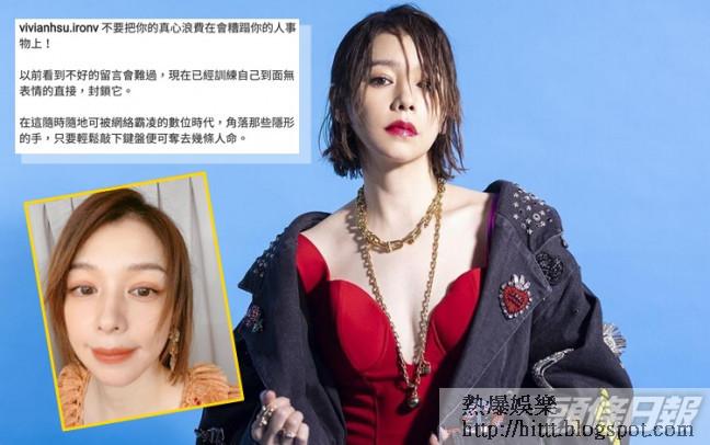 作為公眾人物有讚,亦難免有批評聲音,46歲台灣藝人徐若瑄(Vivian)近日在社交網發文,指以前看到不好的留言會難過,現在卻訓練到自己「面無表情的直接封鎖它」,以「鋼鐵心」抵禦這些酸民,她表示:「在這隨時隨地可被網絡霸凌的數位時代,角落那些隱形的手,只要輕鬆敲下鍵盤便可奪去幾條人命。 #不要讓你的鍵盤比病毒還可怕 #公眾人物都要有強大的抗壓性」又籲大家「愛自己為自己好好的活着」、「為了愛我們的人好好活着」、「不為不愛我們的人而傷害自己」,並謂:「不要把你的真心浪費在會糟蹋你的人事物上!」
