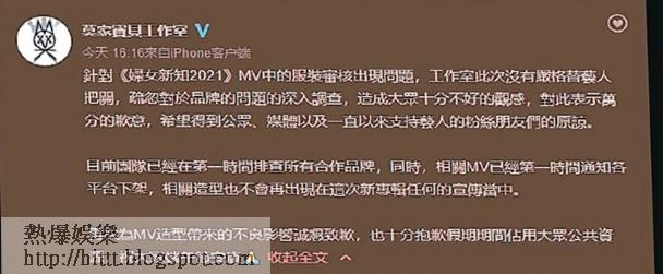 對於MV服裝品牌涉及辱華風波,Karen工作室昨日在社交平台發文道歉:「針對《婦女新知2021》MV中的服裝審核出現問題,工作室此次沒有嚴格替藝人把關,疏忽對於品牌的問題的深入調查,造成大眾十分不好的觀感,對此表示萬分的歉意。目前團隊已經在第一時間排查所有合作品牌,同時,相關MV已經第一時間通知各平台下架,相關造型也不會再出現在這次新專輯任何的宣傳當中。」而今次是歌手兼形像指導馬天佑的工作室幫Karen設計造型,他亦有在社交平台發文道歉:「本工作室旗下造型師作為此次新MV的造型設計,因考慮不周導致極其惡劣影響,對莫文蔚小姐以及大眾表示十分誠懇的歉意,對不起!」而昨晚Karen開第2場騷前,她在社交平台上載在紅館後台的短片,見她手舞足蹈,與工作人員拍手打氣,看來心情未受影響。