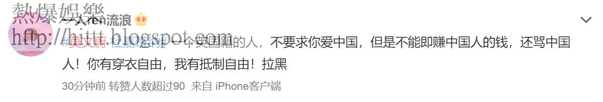 鬧爆Karen辱華嗰班人,有狠鬧,亦有懶可惜咁鬧,包括「我以為大家都忘了杜嘉班納那個事件了呢,看了這個熱搜莫名感動」、「可真的好惡心哦,一邊吃着你的飯一邊砸着你的碗」、「確實是有穿衣自由,不過希望別來賺中國人的錢了」。仲有啲係一啖砂糖一啖__:「她私下穿甚麽是她的自由,畢竟人家並不是中國人,也不在意杜嘉班納侮辱整個亞裔,但請圓潤的滾開大陸,MV裏公開穿辱華品牌,還來掙錢就是你的不要臉了。」「穿甚麽是個人的自由,粉轉黑也是我的自由!既然不在乎中國人的感受,那就滾吧!」OK,最叻叫人「滾」或「滾出中國」,典型小粉紅特色,完全不意外。