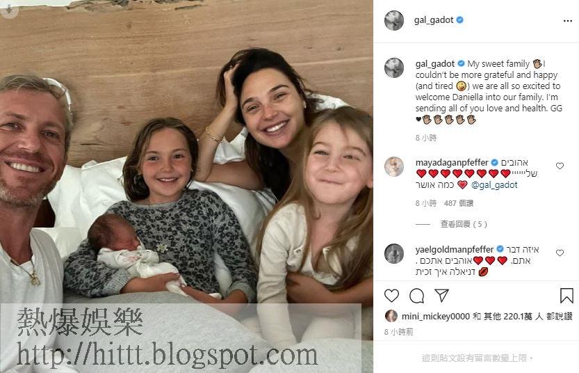 今年3月出席金球獎頒獎禮後,宣佈三度懷孕的神奇女俠姬嘉鐸(Gal Gadot),於香港時間6月30日凌晨發文,宣佈已為以色列地產大亨老公Yaron Varsano誕下第三名女兒。她貼出一家五口合照,見到Gal Gadot素顏入鏡狀甚疲累,但依然明艷照人露出幸福笑容留言:「很興奮迎接Daniella加入我們的家庭,希望給你所有的愛和健康。」9歲長女Alma抱住初生妹妹,而4歲次女Maya亦笑得很開懷,短短8小時已超過220萬讚好。