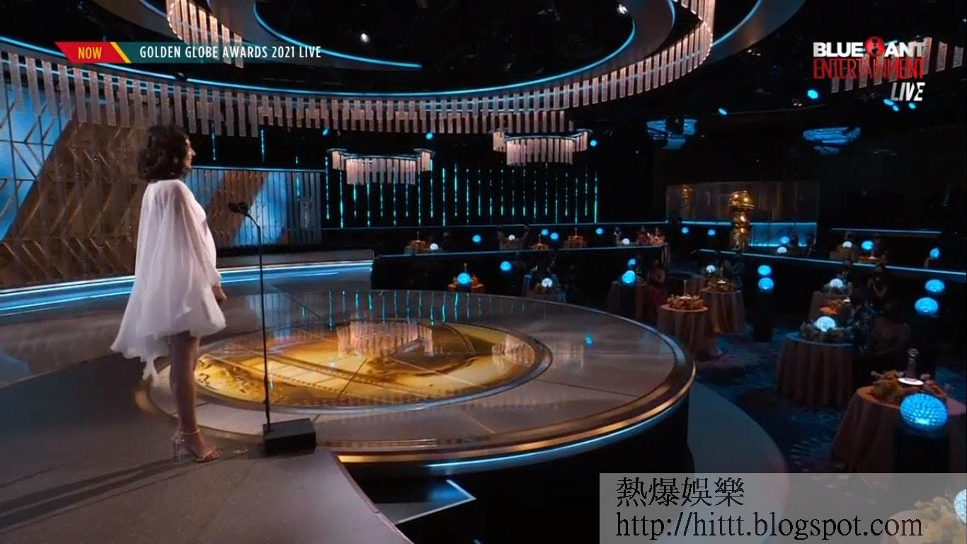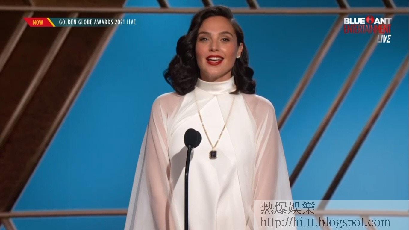 現身《第78屆金球獎頒獎禮》(Golden Globes)擔任頒獎嘉賓時,姬嘉鐸(Gal Gadot)呢身白色娃娃裙已孕味甚濃。(影片截圖)