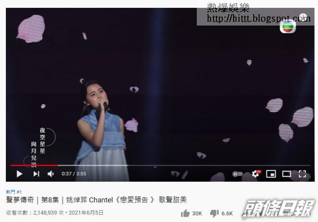 TVB《聲夢傳奇》比賽進入白熱化階段,9位參賽者昨晚為節目錄影。姚焯菲(Chantel)上回合演唱《戀愛預告》,片段上載10日超過200萬點擊,人氣追過大熱參賽者炎明熹(Gigi)。Chantel開心表示選對了歌,因為曲風本身亦很sweet。問到被追上的Gigi會否不開心?她大方表示:「唔會覺得唔開心,最重要係幫到收視,冇邊個超越邊個嘅問題。」Chantel補充,比賽以來視大家是戰友,一直以來都是跟自己比較。