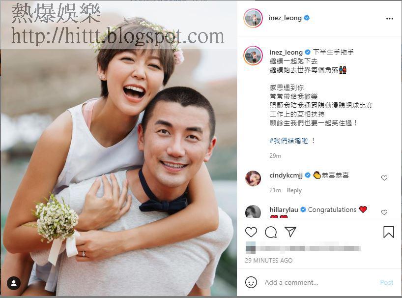 而梁諾妍則說︰「下半生手拖手,繼續一起跑下去,繼續跑去世界每個角落,感恩遇到你,常常帶給我歡樂,照顧我陪我通宵睇動漫睇網球比賽,工作上的互相扶持願餘生我們也要一起笑住過!#我們結婚啦 !」