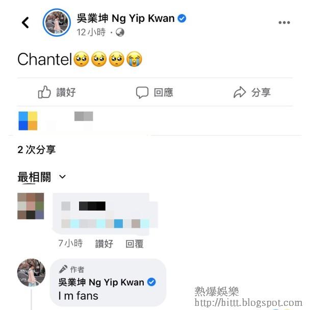 原來「師兄」吳業坤是Chantel鐵粉之一,他更不避嫌於社交網寫下「Chantel」,然後再在留言位補充:「i'm fans」,又指「生到個咁嘅女就好囉,不過又會勁擔心。」身為Chantel《聲夢》導師的JW(王灝兒)忍不住搭訕:「你放過佢啦。」吳業坤繼續自high:「我係(喺)公司見到佢都唔敢打招呼。」網民因此反應兩極,有人與JW同一睇法,留言取笑吳業坤,更有人留言:「你等多佢4年啦,媽媽話未夠18歲唔可以拍拖㗎。」