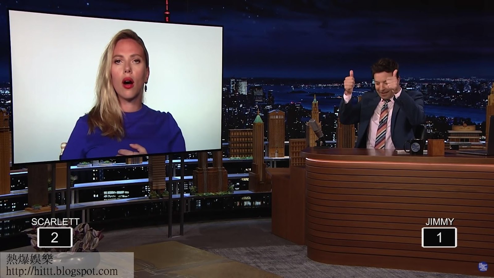 6. 呢題施嘉莉祖安遜跟Jimmy Fallon賭上了1000分。(影片擷圖)