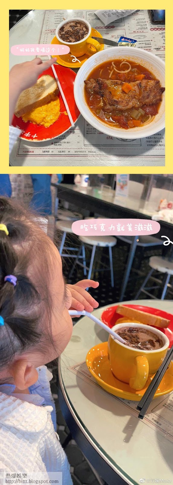 原本以為天王之家,平日飲飲食食都會比較講究,但想不到Moka會帶女兒去食茶餐廳,而且郭小姐對茶記的熱朱古力相當喜愛,而為了女兒飲得方便,Moka讓女兒用飲管飲,看得出郭小姐為求飲到心愛飲品,相當搏命。