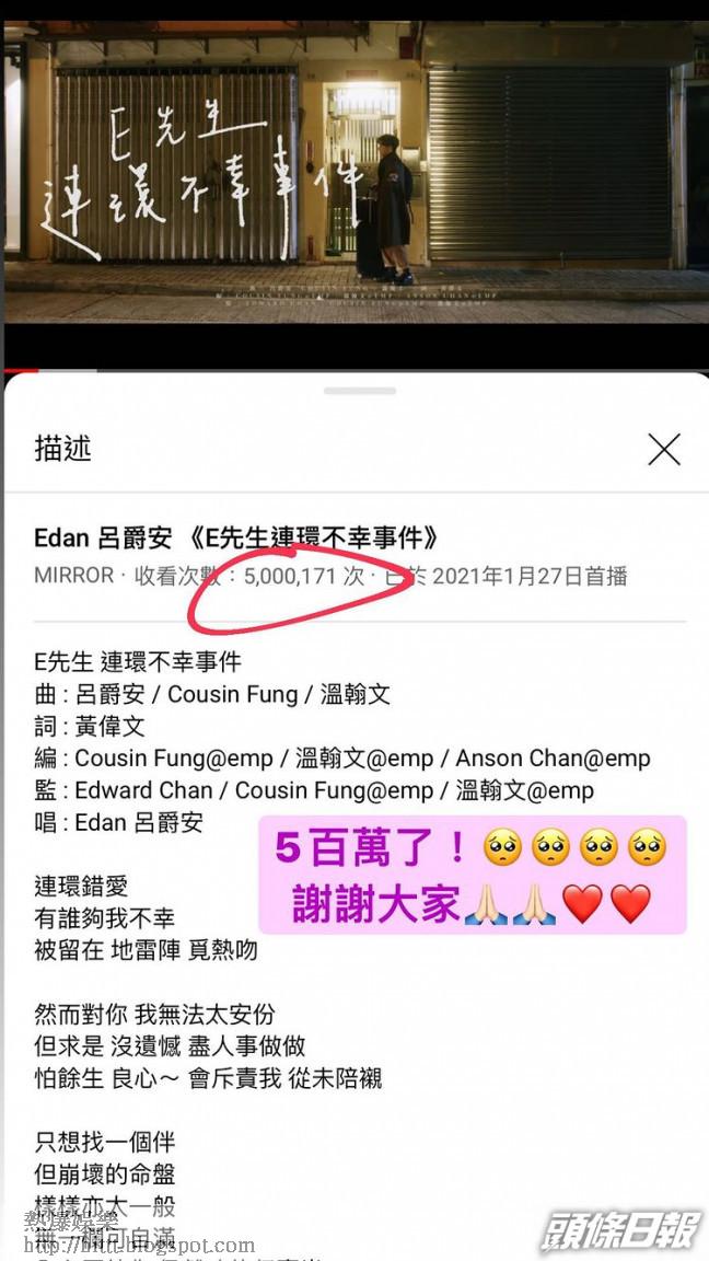 AL也在其社交網貼出拍攝片段,他雖然笑場,不過就笑得好Sweet,而且即刻再入戲好專業!Edan指:「望住我會忍唔住甜笑都好正常☺️」,獲對方回覆「幫你綁緊鞋帶呀甜笑~」,戲裡戲外關係都咁好,真係好閃呀。另外,AL凌晨在限時動態透露正拍攝Solo新歌MV,而Edan於今年1月推出的個人歌《E先生連環不幸事件》點擊亦超越500萬次。