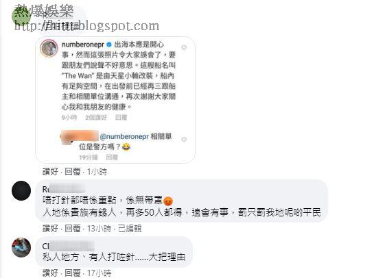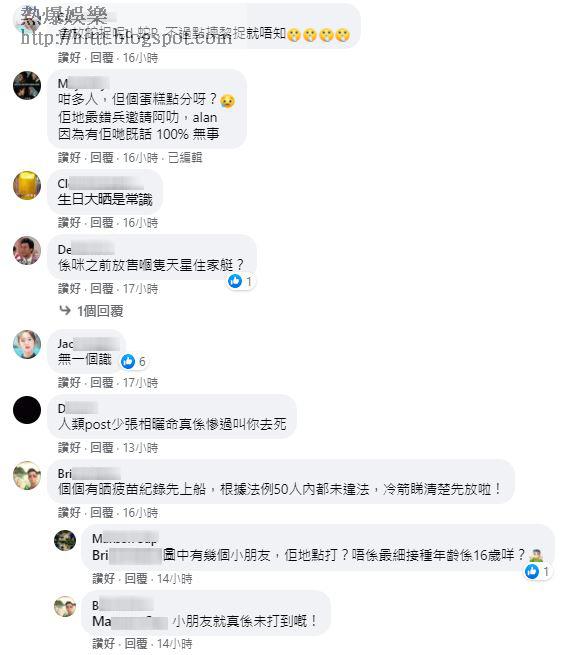 由於不少網民看到眾人沒戴口罩,也沒保持社交距離,恐變成播毒溫床,惹來網民熱烈討論防疫政策存在灰色地帶,隨時爆出「PR群組」,紛紛留言「生日大晒是常識」、「仲要全部唔戴口罩」、「人類post少張相晒命真係慘過叫你去死」及「名人有錢佬有遊艇,私人地方大晒,驚你唔知,限聚令只應用喺我哋基層賤民!公關出色」等,另有網民寫道:「個個有晒疫苗紀錄先上船,根據法例50人內都未違法,冷箭睇清楚先放」被網民反擊稱圖中有幾小朋友,「佢哋點打?唔係最細接種年齡係16歲咩」,認為帶小朋友出席群體聚會不戴口罩也存在風險。
