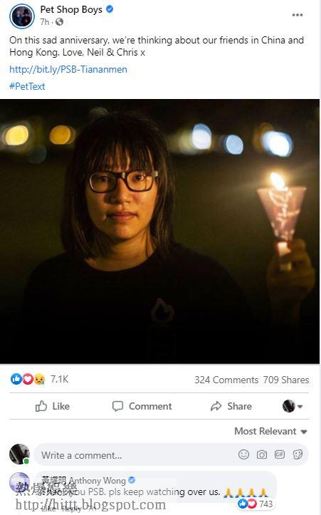 Pet Shop Boys兩位成員Neil Tennant和Chris Lowe在香港時間今早5點多,分別在FB、IG和Twitter貼上一段關於香港人點蠟燭悼念六四的BBC新聞報道,並留言:「在這個傷心的周年紀念,我們正在掛念着中國和香港的朋友。」PSB留言後,「明哥」黃耀明在數分鐘後亦隨即回應感謝他們,還請他們繼續關注香港人。Pet Shop Boys過去與香港有不少淵源,他們在1989年六四事件的3星期後,在香港舉行首次正式的巡迴演唱會。25年後,兩人又於2014年9月雨傘運動揭幕時,在亞博館開騷。
