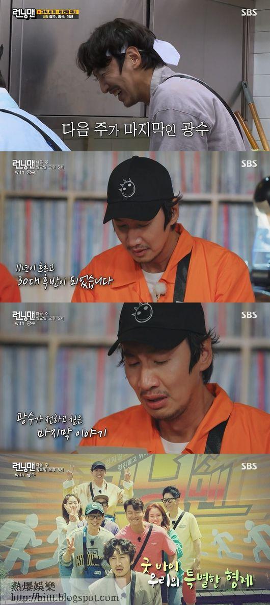 韓國SBS人氣綜藝節目《Running Man》(RM)今年開播11周年,但早前35歲元祖成員李光洙宣佈退出節目,他已於上月24日進行最後一集的錄製,而該集將於下周日(13日)播出。《RM》亦公開最新預告,當中可見光洙準備了信件給成員,不過他顯得難捨難離,當他拿着信件想讀出時,他卻難忍離別情緒讀不下去,並喊住表示「對不起...」,令其他成員都大感傷感,宋智孝亦難過得低下頭兼眼濕濕。
