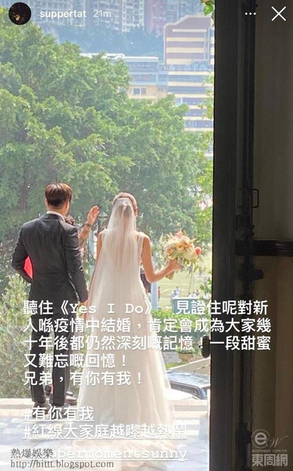 樂隊Supper Moment的32歲主音Sunny(陳仕燊)去年9月宣佈向拍拖6年的圈外女友Emily成功求婚,原來昨日二人已行禮,Sunny正式成為「老襯」!事後Sunny於社交網上載婚照,並留言:「執手開始一輩子的旅程」相中,穿上禮服的他拖着新娘一齊向鏡頭甜笑回望,另一張則是一對新人在教堂大門前咀嘴,幸福滿瀉,一眾圈中好友周柏豪、張繼聰、李幸倪等紛紛送上祝福。