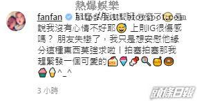 結果相隔約兩小時,范范再上載一張有「今天也要加油呀!」字句的圖,並留言解釋:「那麼多朋友問我怎麼了😆是說我沒有心情不好耶😅上則IG很傷感嗎?朋友失戀了,我只是想安慰他緣分(份)這種東西莫強求拍塞拍塞(指抱歉)那我趕緊發一個可愛的🍰🍧🍬🍭🍯🍩🧁🍦^_^」不少網民睇見都表示以為她想不開,搞到大家都好擔心!