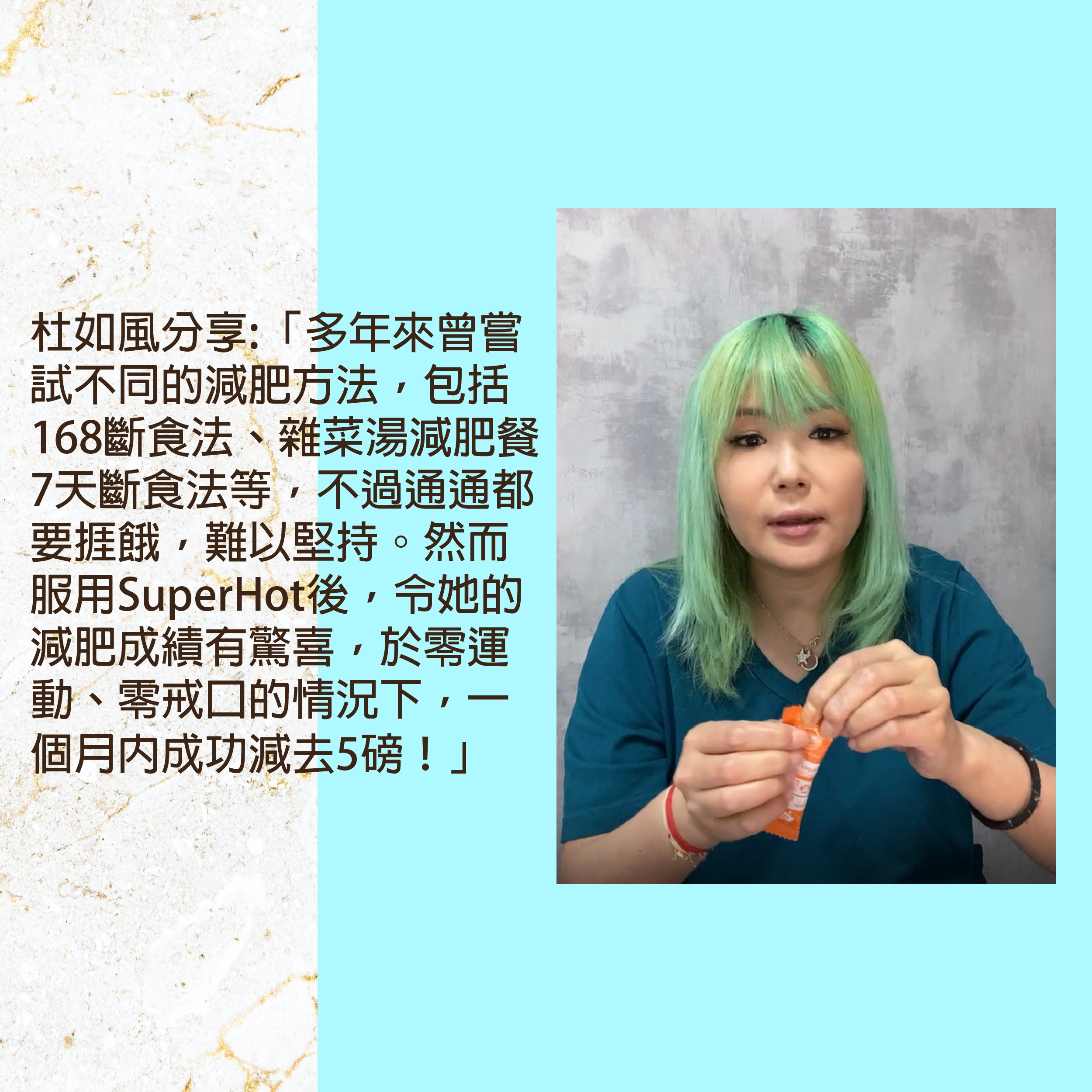 46歲的杜如風近日於真人秀節目中盡顯其「Hea爆」一面,除了專業級「扮工」成為網民熱話外,連帶身形亦備受關注。她近年時肥時瘦,連自己亦忍不住自嘲「肥風」。她分享多年來曾嘗試不同的減肥方法,包括168斷食法、雜菜湯減肥餐,7天斷食法等,不過通通都要捱餓,難以堅持。而她近期則試行大熱的生酮飲食,不過踏入「中女」之齡,新陳代謝減慢令減肥難上加難,加上她一貫的懶人作風,減肥期間亦沒有嚴格戒掉澱粉質。然而,她的減肥成績令人驚喜,於零運動、零戒口的情況下,一個月內成功減去5磅,秘訣原來靠Superfood Lab新出的SuperHot Fat Burn™抗醣燃脂素。