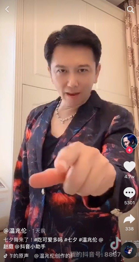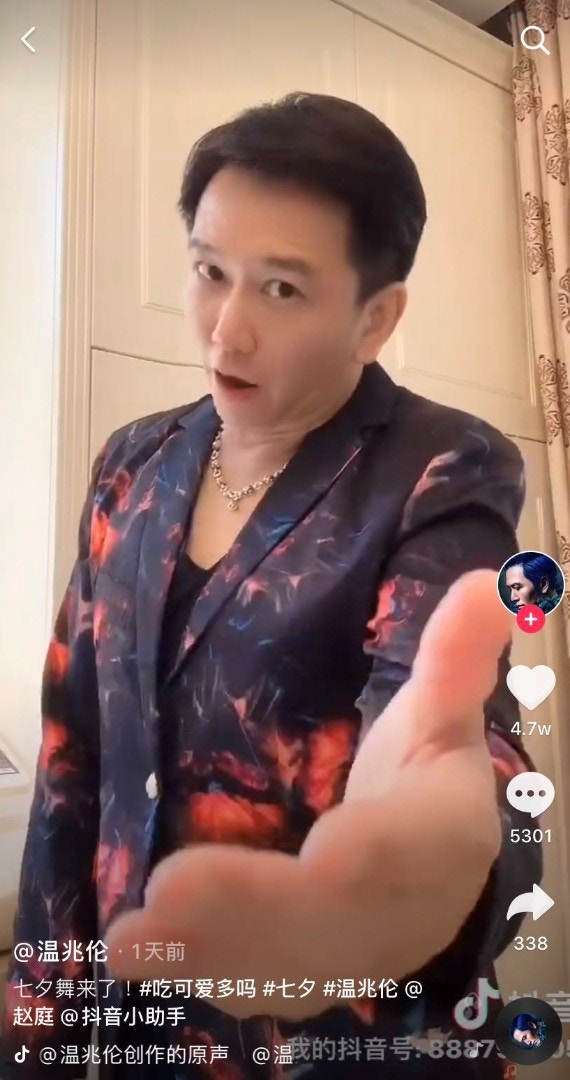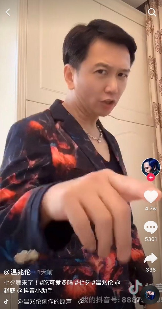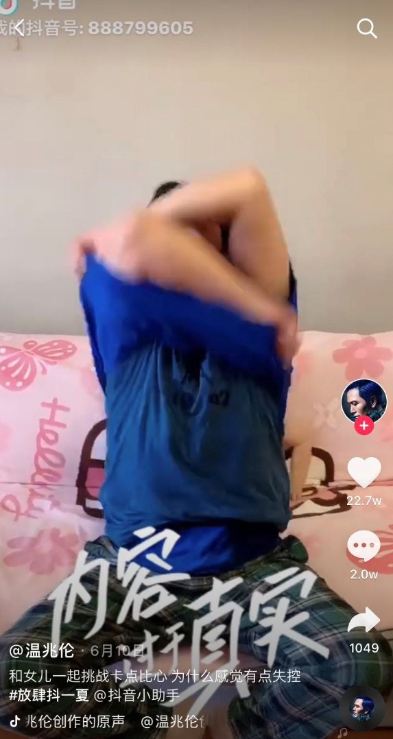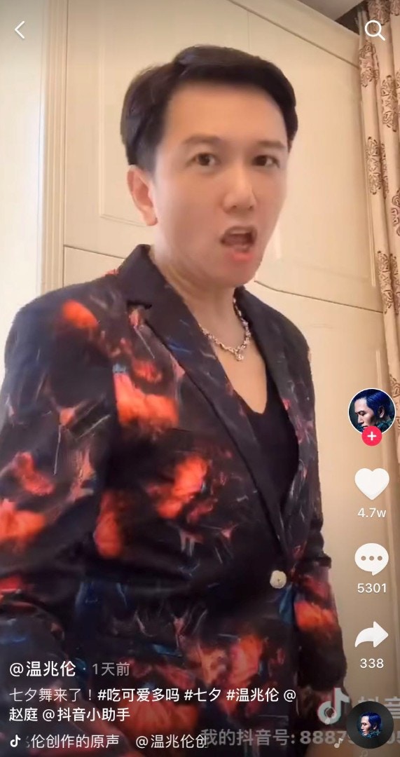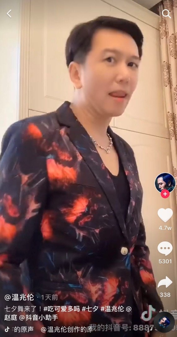 溫兆倫除了拍片表現他的愛國心外,亦不時分享自己的生活日常,尤其喜歡拍攝一些搞笑短片,其中一條是拎著寫上「如何控制你的脾氣」的A4紙,然後大發脾氣,讓網民看得一頭霧水。另一條視頻,是說幫人還2000萬欠債,但之後又急急腳走人,雖然內容不知所云,但內地網民卻甚為受落,證明他近年在內地甚有人氣。不過昔日靚仔的溫兆倫,雖然減肥成功,變得面尖尖,但眼角卻出現嚴重下垂,看來他要好好注意保養。