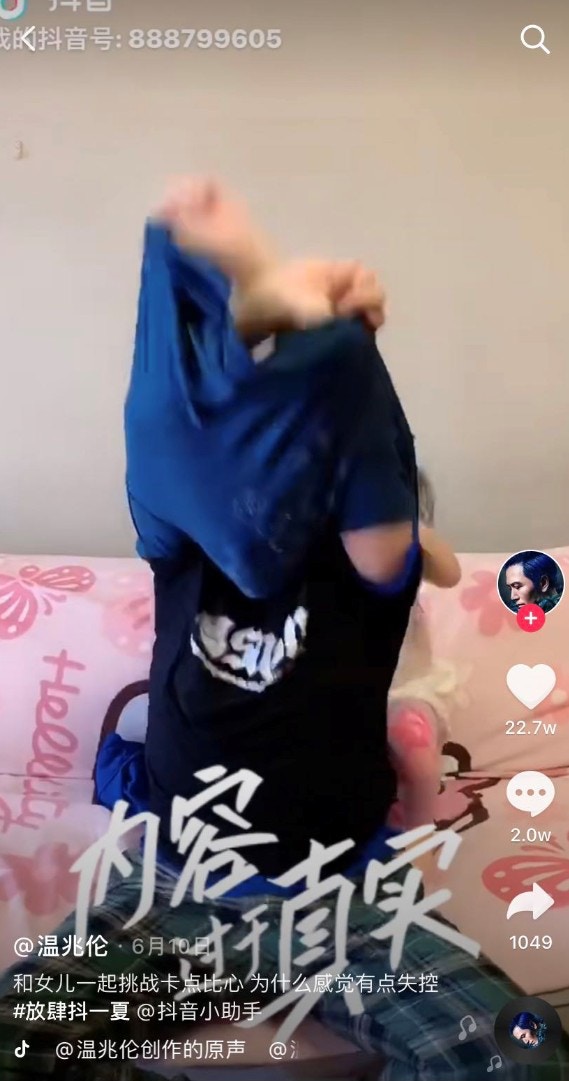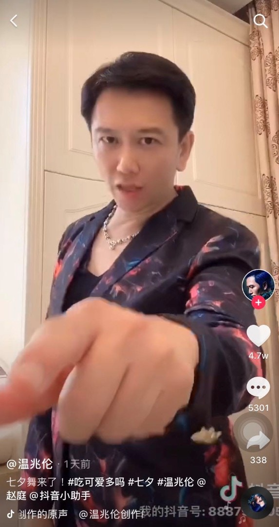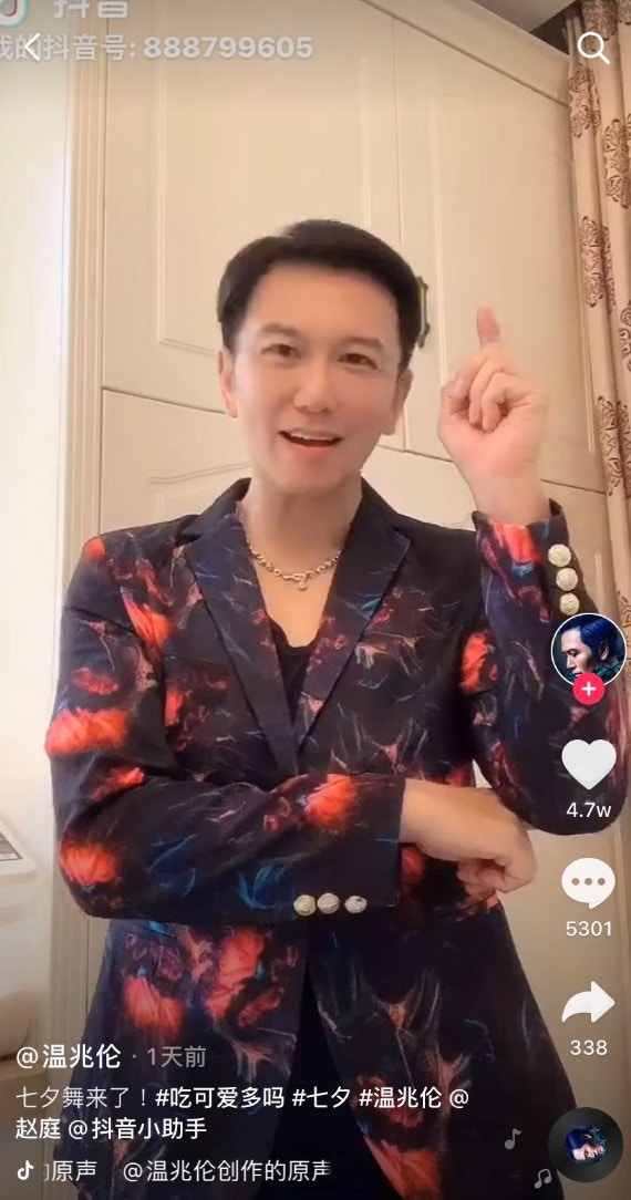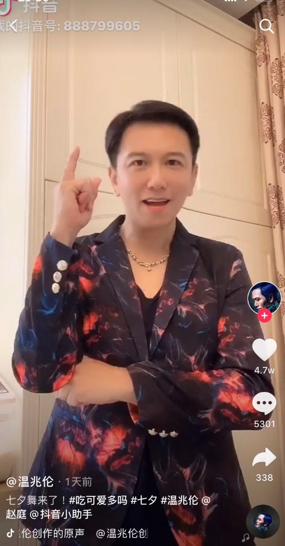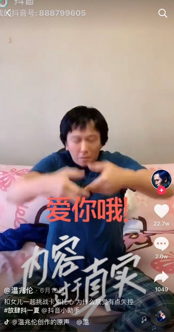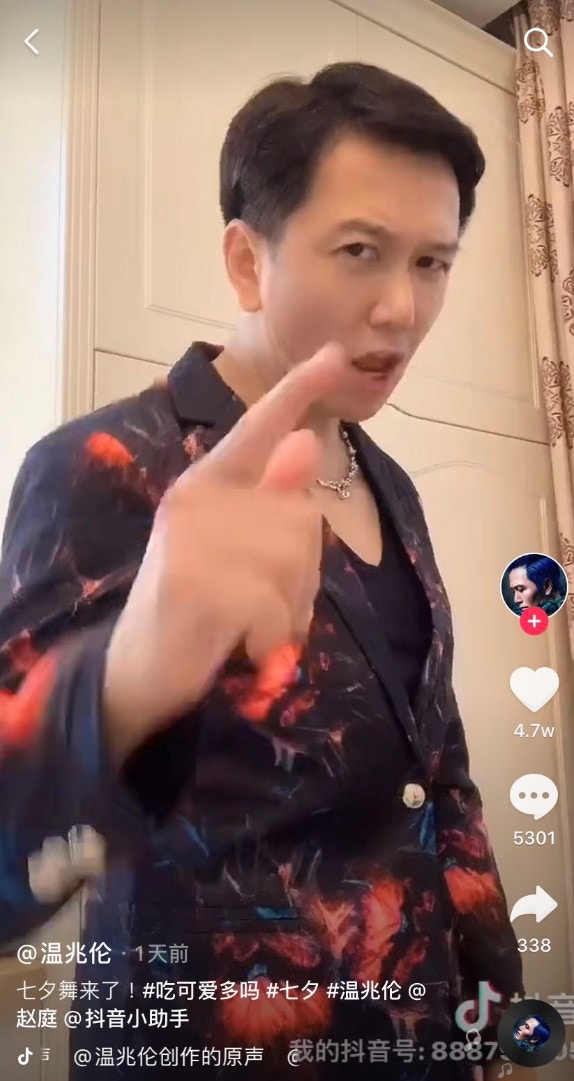 溫兆倫除了拍片表現他的愛國心外,亦不時分享自己的生活日常,尤其喜歡拍攝一些搞笑短片,其中一條是拎著寫上「如何控制你的脾氣」的A4紙,然後大發脾氣,讓網民看得一頭霧水。另一條視頻,是說幫人還2000萬欠債,但之後又急急腳走人,雖然內容不知所云,但內地網民卻甚為受落,證明他近年在內地甚有人氣。不過昔日靚仔的溫兆倫,雖然減肥成功,變得面尖尖,但眼角卻出現嚴重下垂,看來他要好好注意保養。