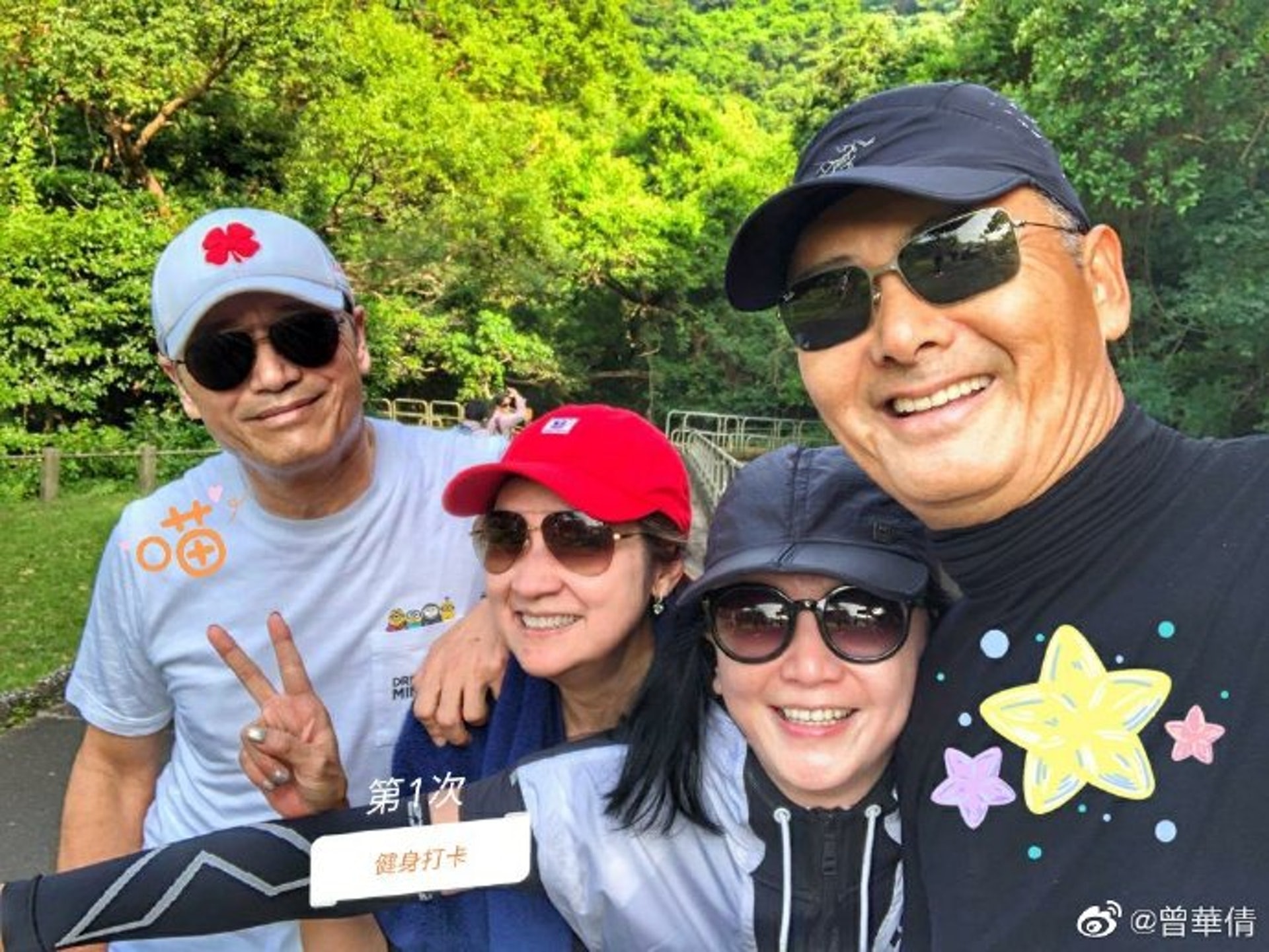 發哥經常跟圈中好友行山。圖為發哥相約曾華倩、戚美珍和苗僑偉行山的合照,他們保養年輕紀錄與做運動有關。(微博圖片@曾華倩)