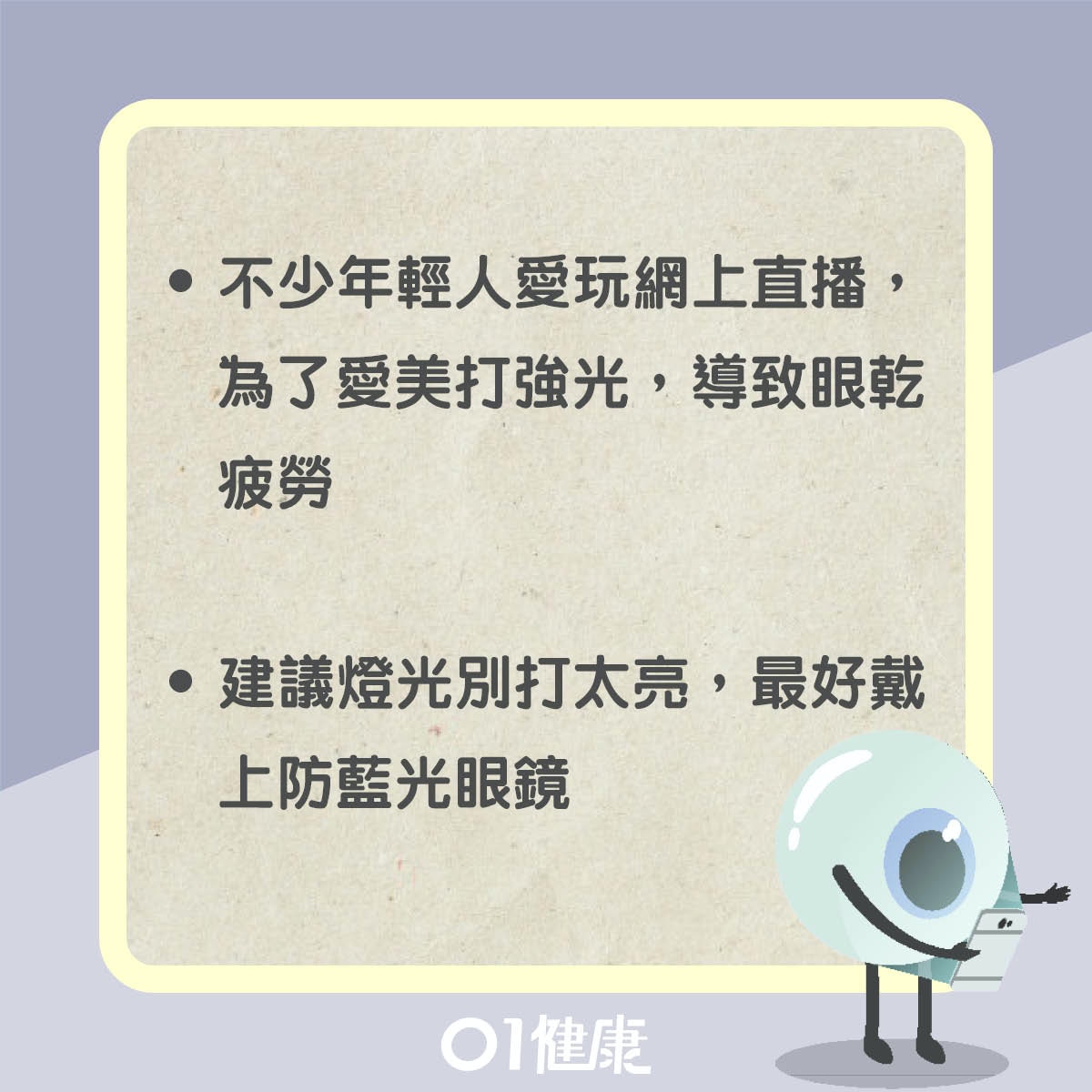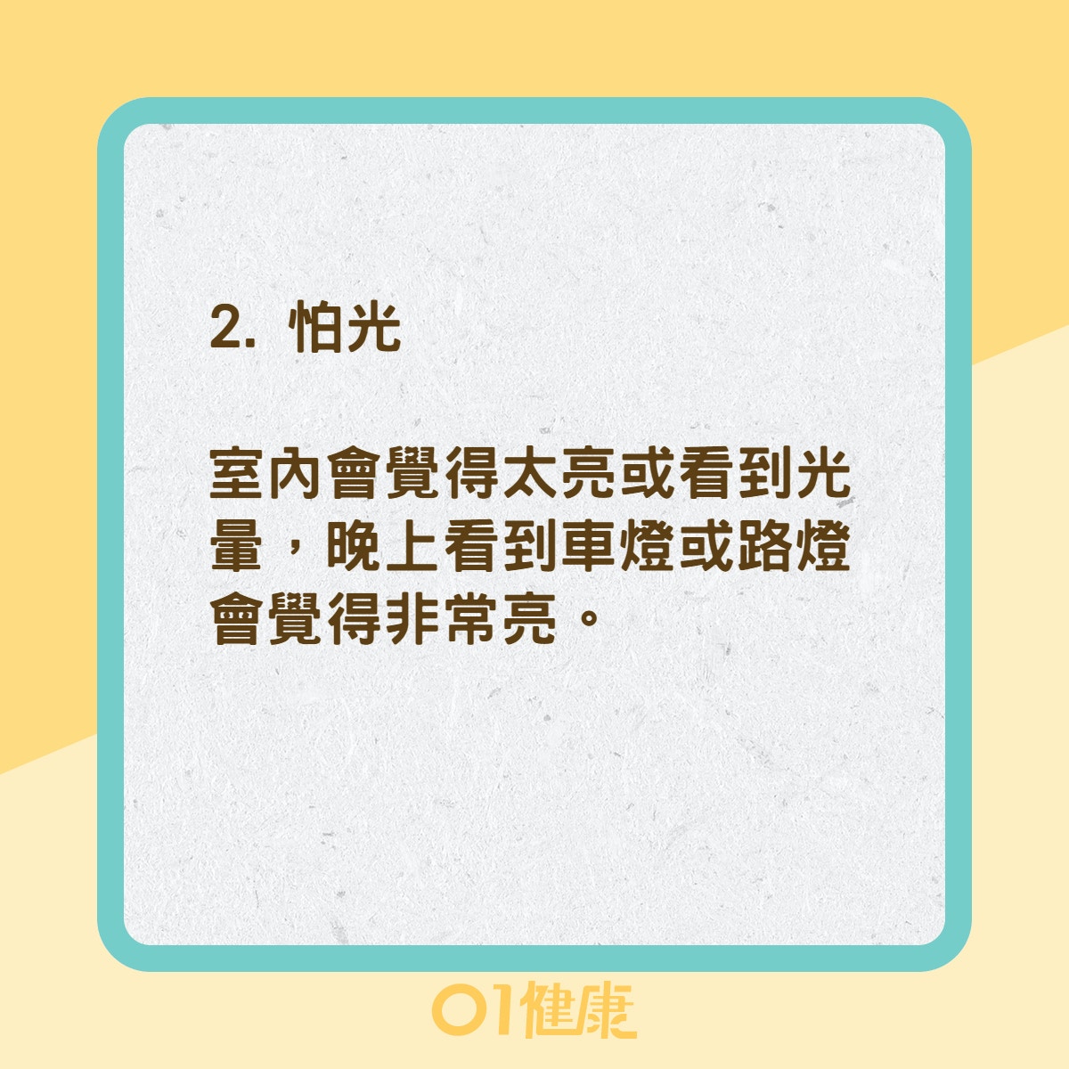 在室內時會覺得所有燈光也很亮或是見到光暈,晚上在街道見到車燈或路燈也覺得刺眼。