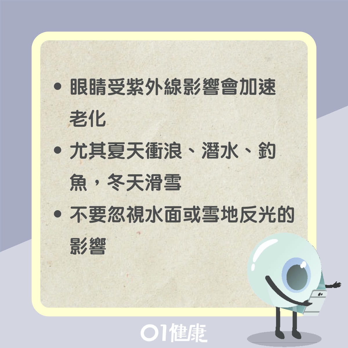 當我們直視太陽10秒,視網膜便會破損。但其實直視太陽極短時間已有機會令視網膜嚴重灼傷,可致白內障、雪盲症等眼疾,又或是永久性的視力受損。如果長期在戶外工作,記緊要配戴適當的太陽眼鏡,避免過多紫外線直射視網膜。
