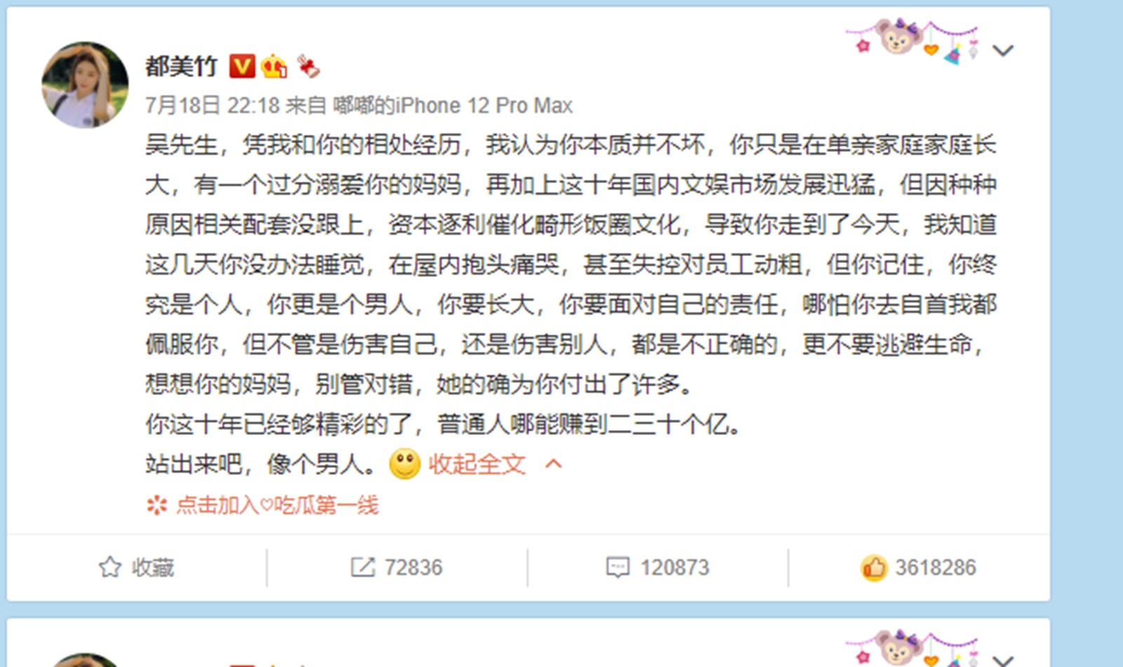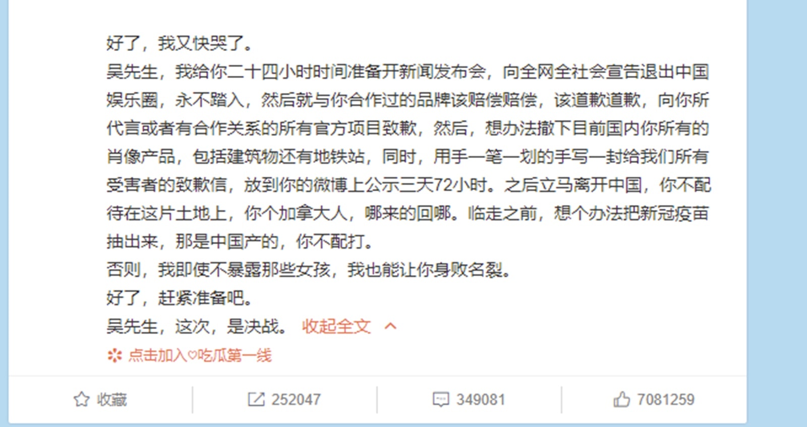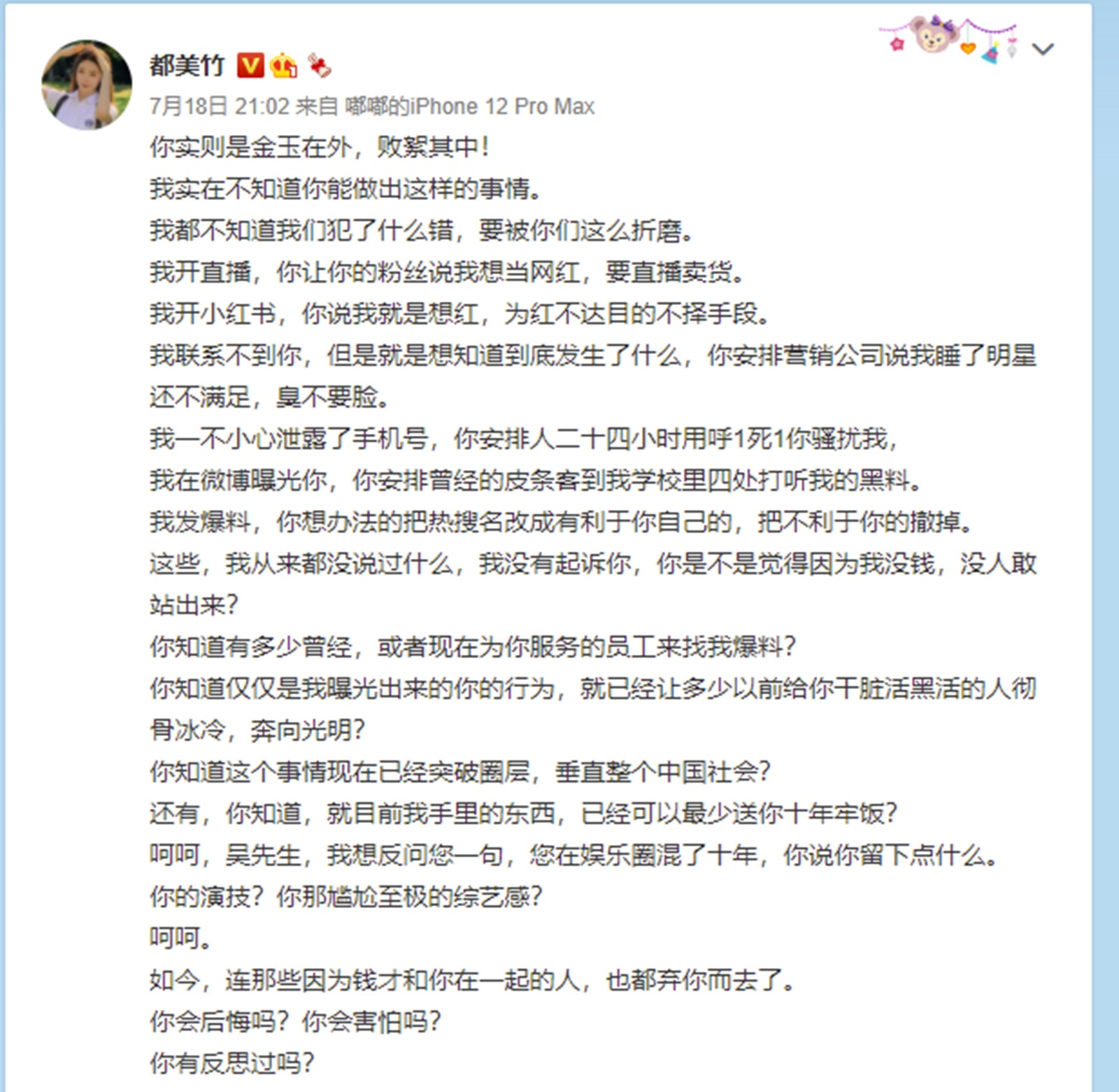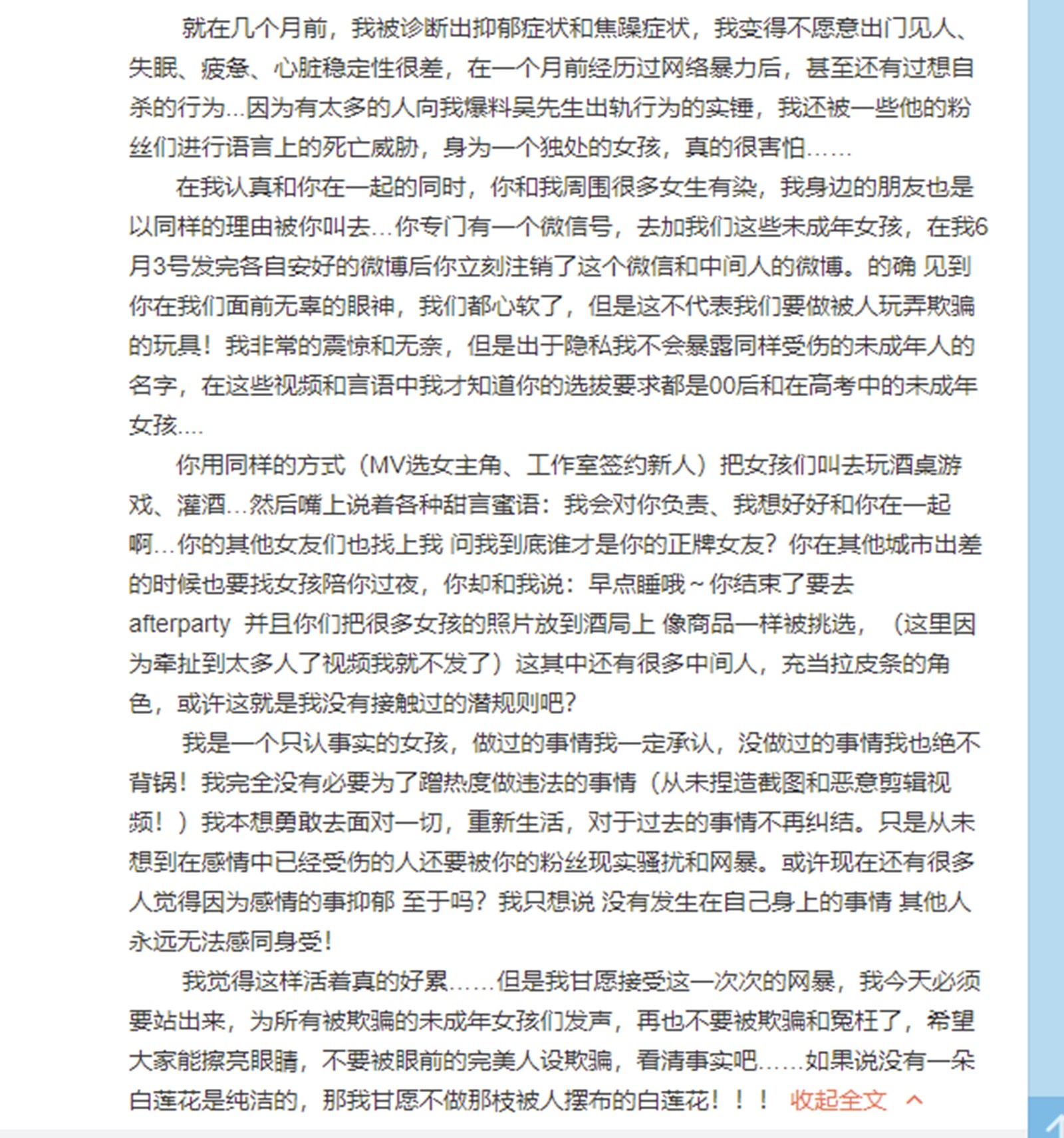 吳亦凡在微博發文回應否認灌酒、收手機、「選妃」、「誘姦」、「迷姦」等多種傳聞,並表示會對自己說的話負法律責任。