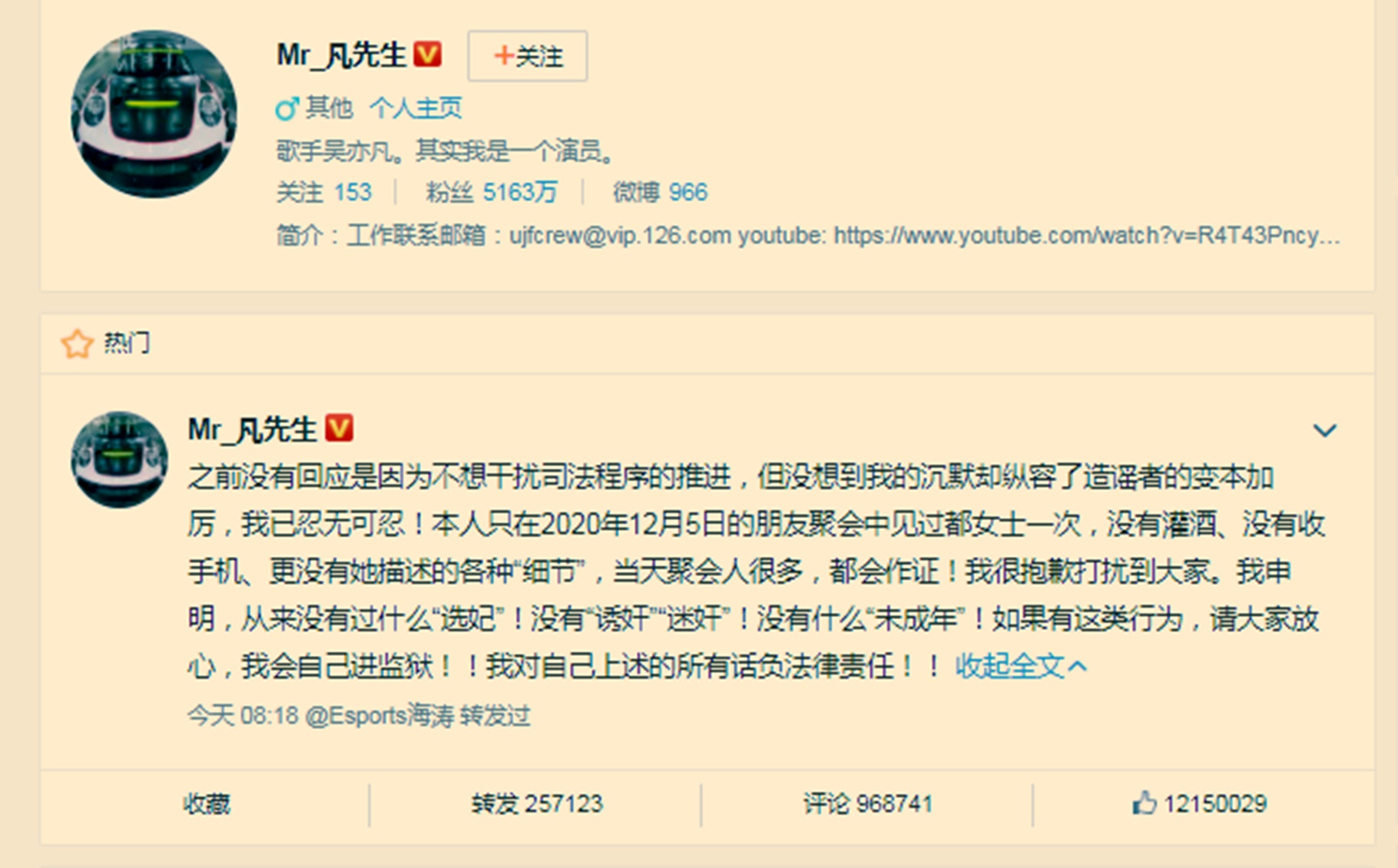 吳亦凡在微博發文回應否認灌酒、收手機、「選妃」、「誘姦」、「迷姦」等多種傳聞,並表示會對自己說的話負法律責任。