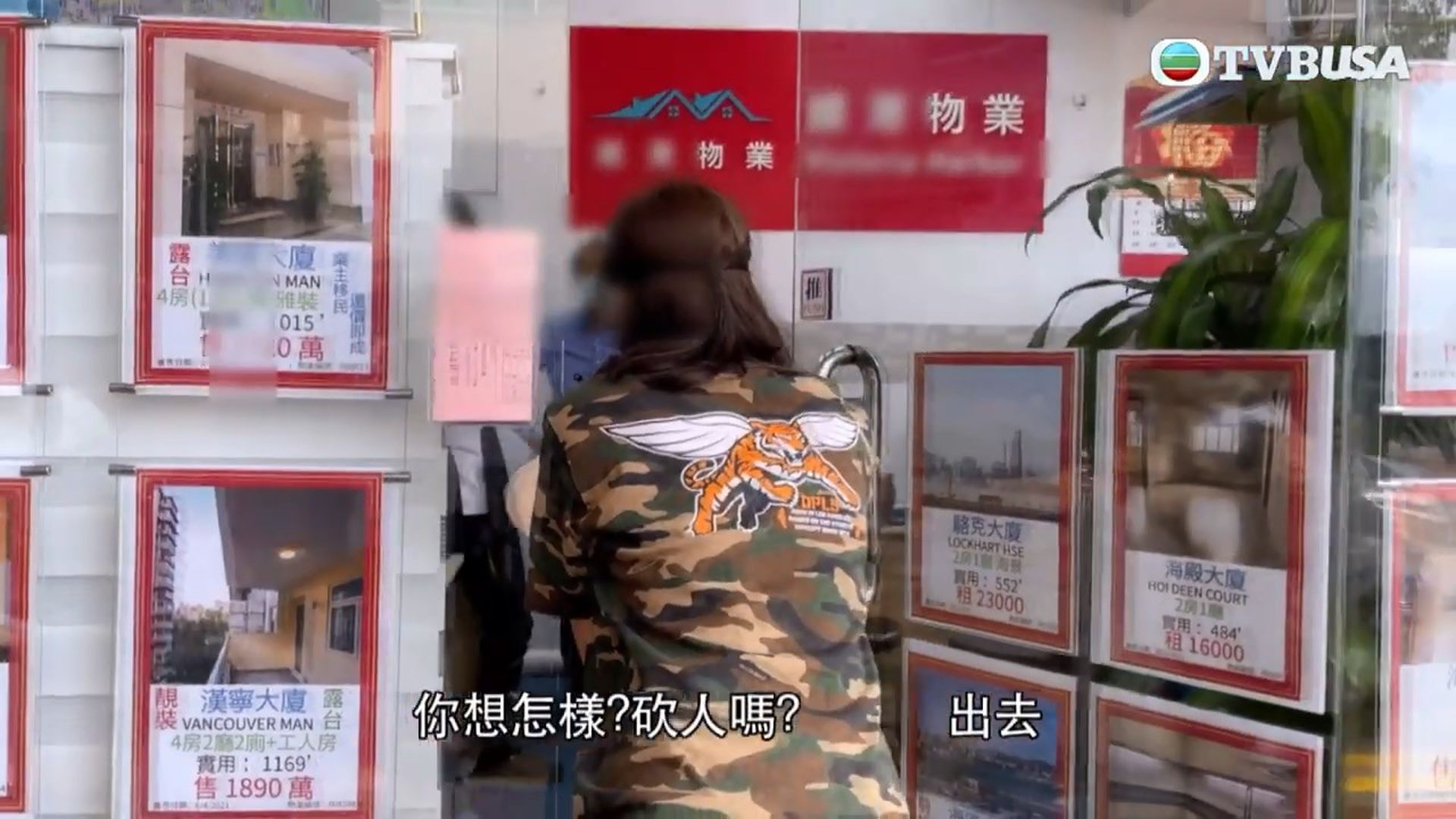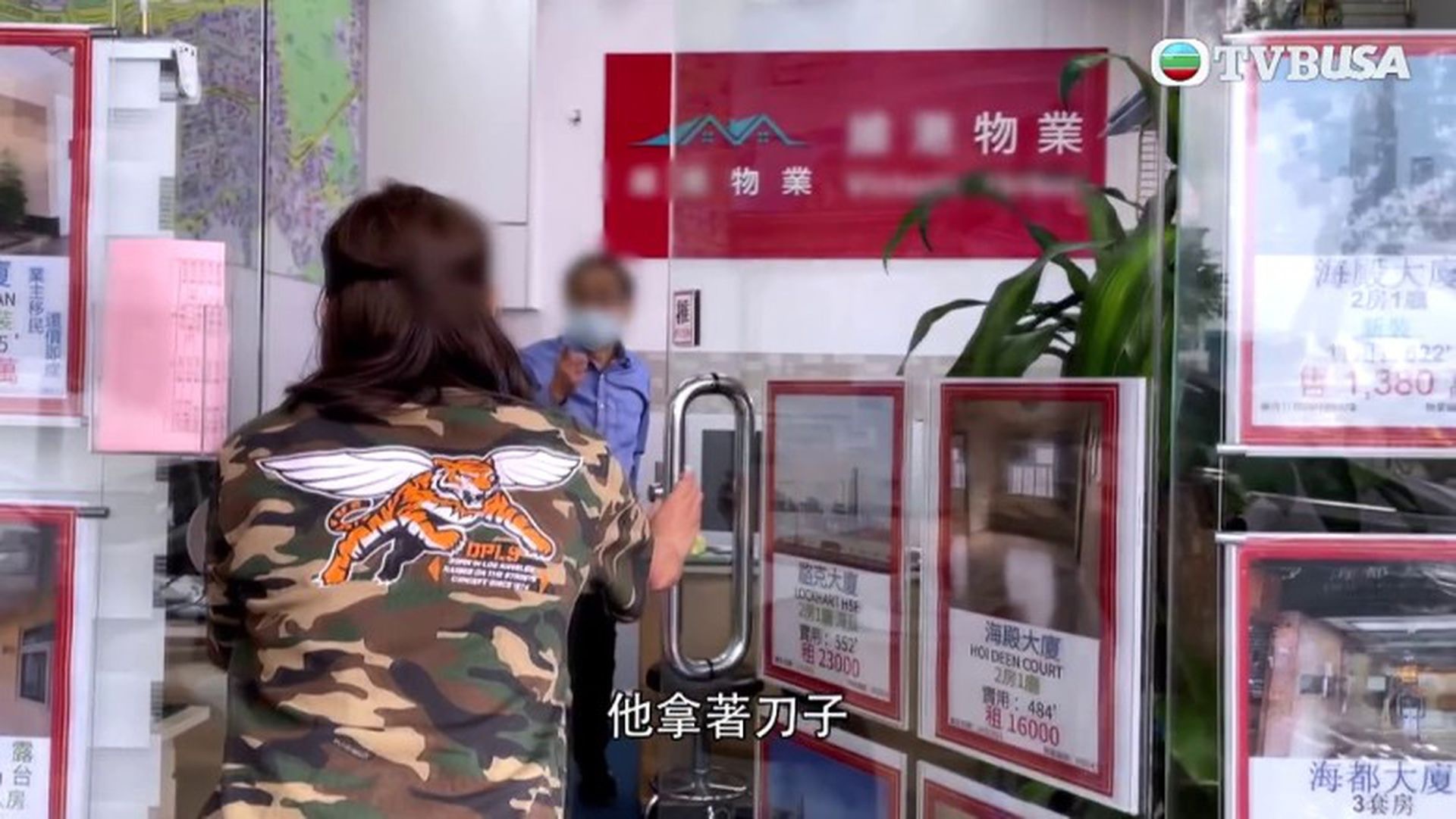 利穎怡行入一間地產舖想找女事主奶奶做訪問時,居然遇上一名男子亮刀指嚇﹗利穎怡接受《香港01》訪問時猶有餘悸:「把刀離我不足一個手掌位。」(節目截圖)