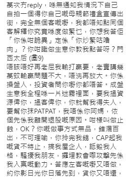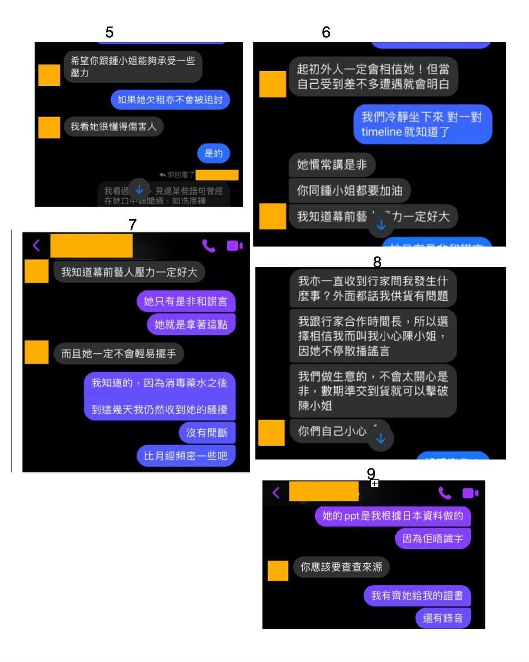 之後,鍾舒漫又叫陳潔玲不要再屈她「輸打贏要」:「老實講幾萬蚊輸贏問題不大,唔使再放大。你係操盤人,投資者問你嘢你都唔答。成盤生意我全程喺一片迷霧裡面,要我搵資源畀你,搵客畀你,你就幫我得失人,要幫你抹Pat Pat,我唔係你阿媽,呢個先係我離開退股嘅原因。咁樣叫做止蝕,OK?」她更稱自己堅持入稟的原因,是對方「無品」、「詆毀我人格」和「騷擾我朋友」。