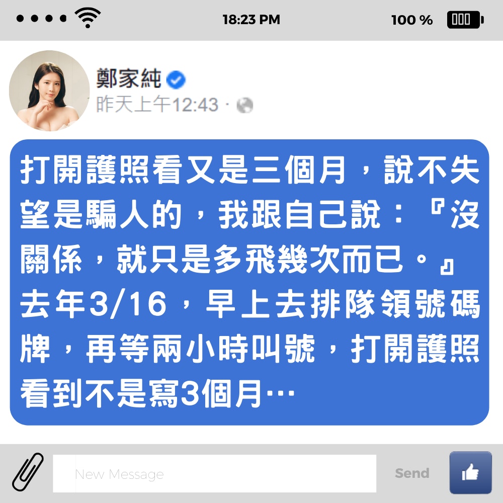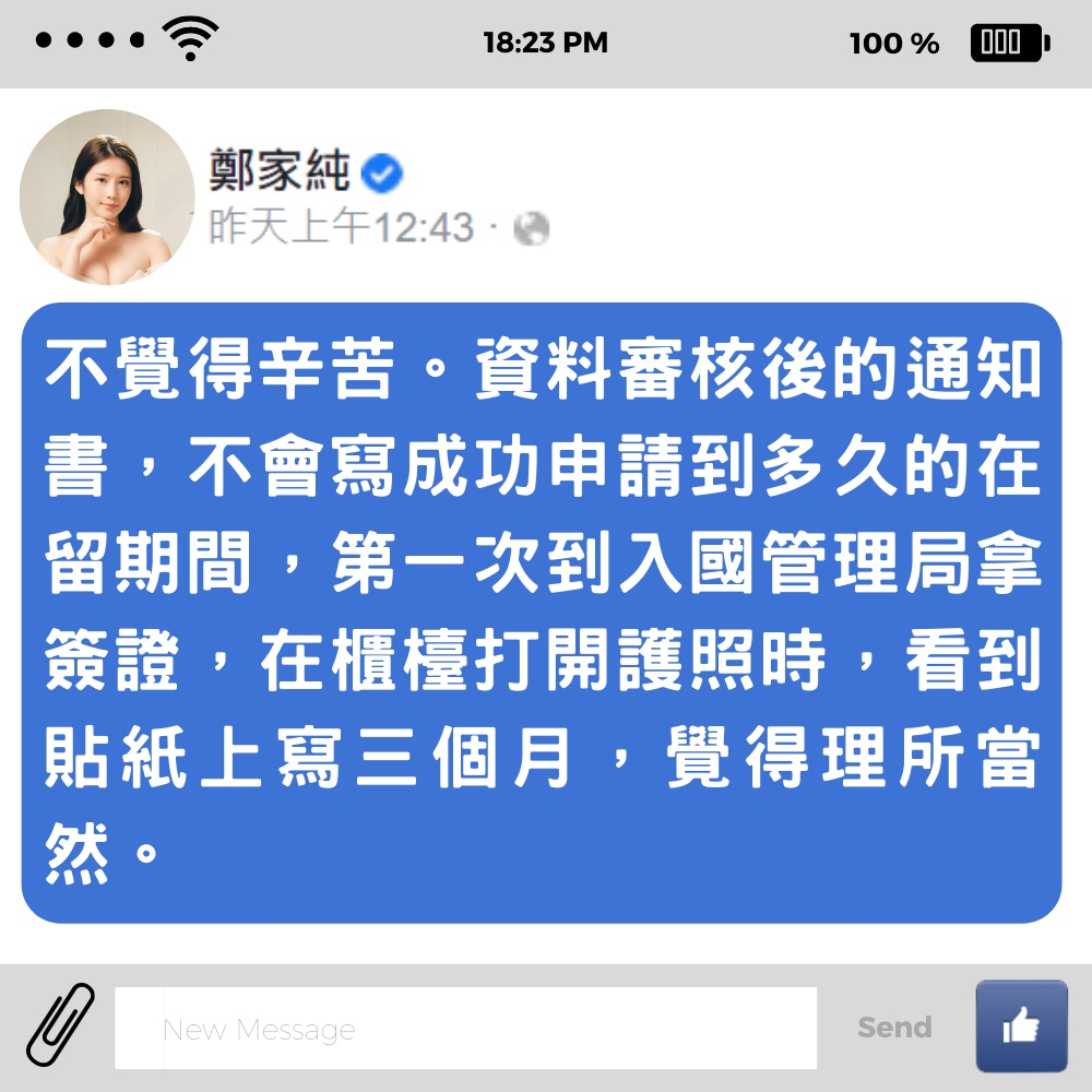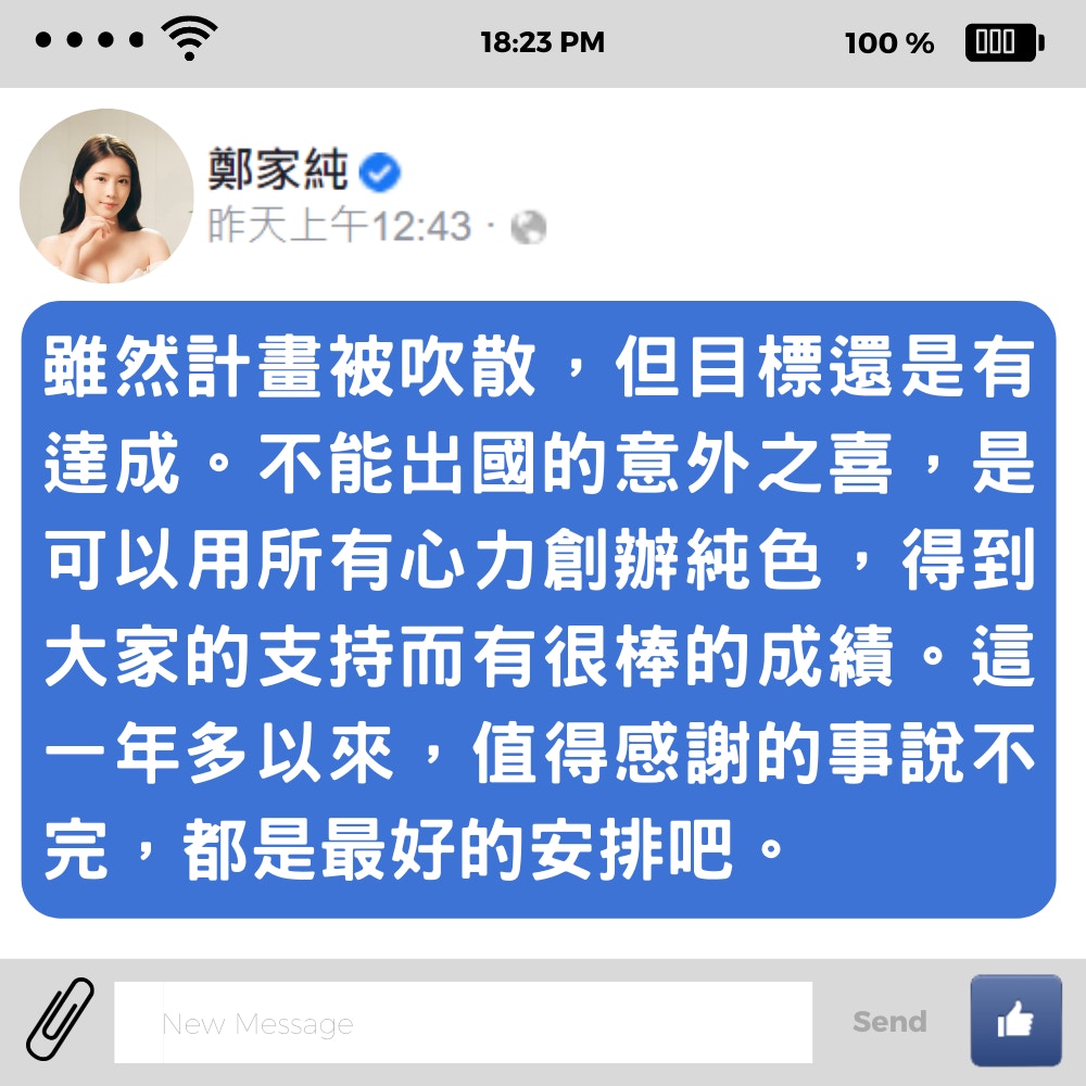而鄭家純這邊也做出回應:「雖然還是不讀不回我的私訊,但我想練習仁慈,前兩篇文章會刪除。」她已將之前兩篇「尋人」的貼文刪除。