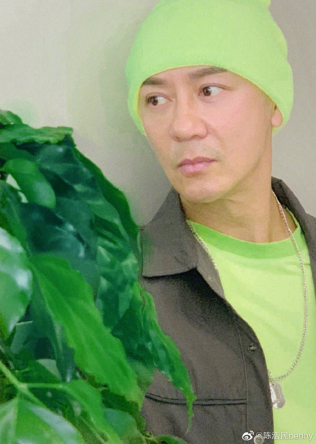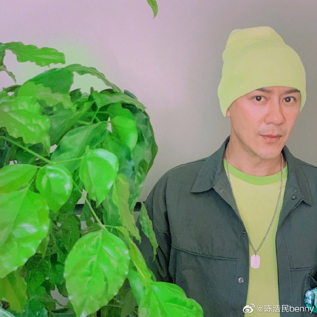 陳浩民呢個綠帽造型相當前衛,但可見他面部消瘦了不少,下巴超尖!(陳浩民Benny微博圖片)
