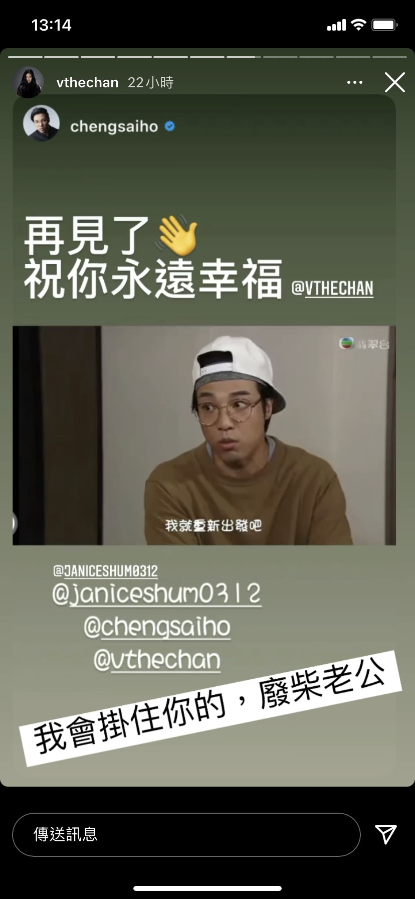 兩人分別於IG post了他們昔日拍攝時的花絮靚相,重溫以往甜蜜時光,並以角色身份向對方剖白愛意以及離婚心情: