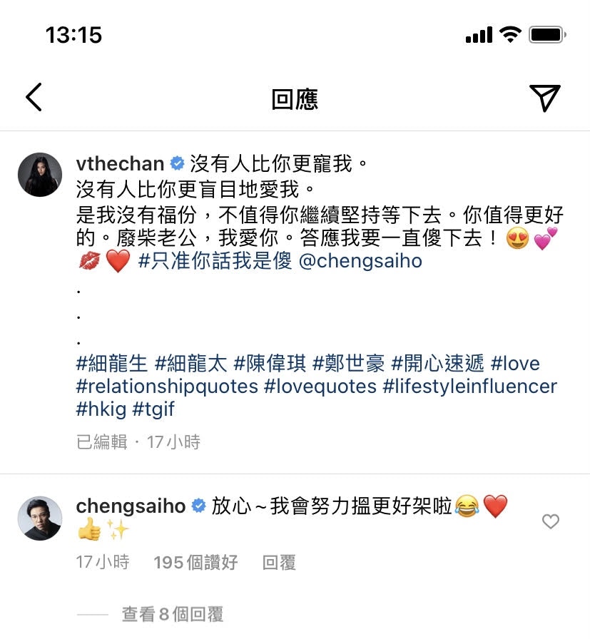 細龍太就表示:「沒有人比你更寵我。沒有人比你更盲目地愛我。是我沒有福份,不值得你繼續堅持等下去。你值得更好的。廢柴老公,我愛你。答應我要一直傻下去!#只准你話我是傻」而細龍生竟回應她說:「放心~我會努力搵更好架啦。」
